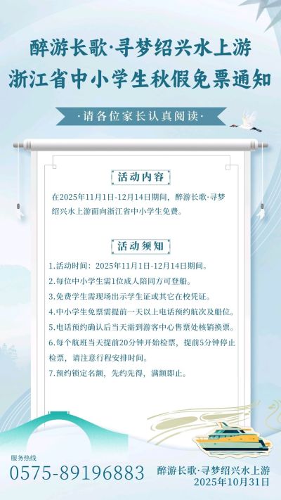 2025年11月1日-12月14日期间,“醉游长歌·寻梦绍兴”水上游面向浙江省全体中小学生免票!