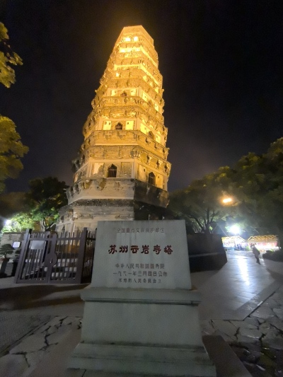 离开拙政园,我们打的前往虎丘景区参观。原计划中的寒山寺因傍晚五点半停止入园参观而未能成行,只好留待下次。而虎丘景区最晚可入园时间在晚上九点,所以我们选择了继续游览虎丘景区。苏州市是传统的工业强市,但在旅游业上也颇为用心——从微信小程序上可以看到很多景点都安排了夜场游览项目。我感慨苏州市政府大气十足,为游客考虑得十分周全。