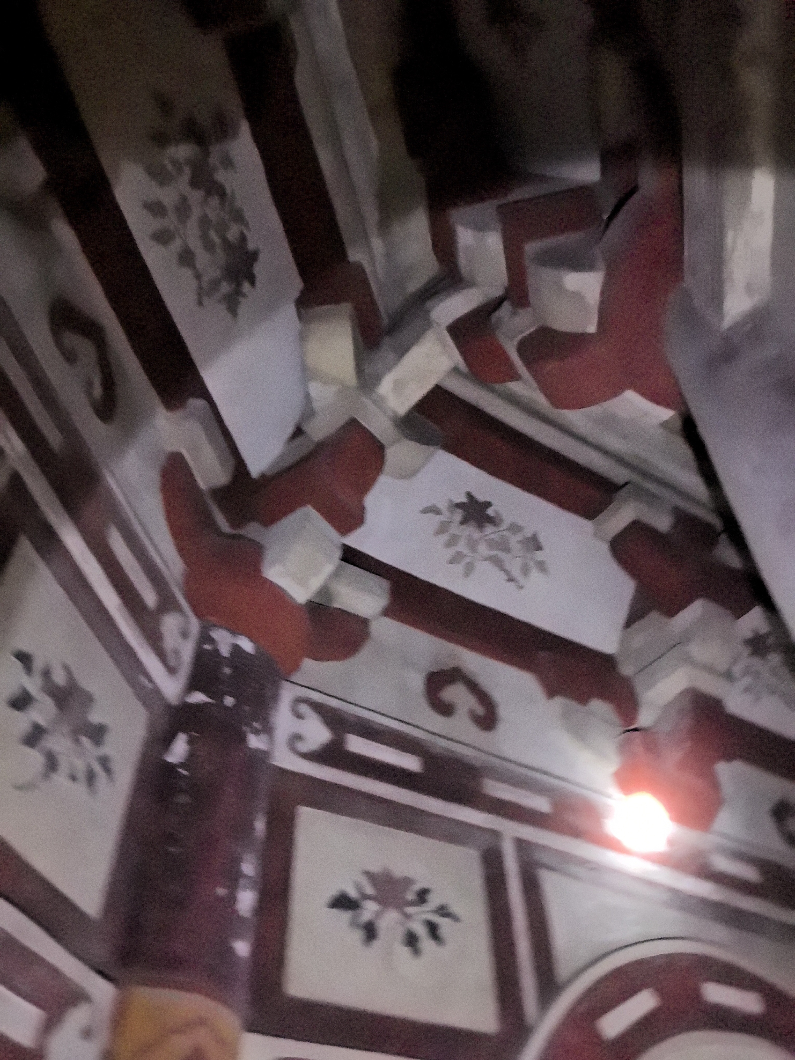 从南宋到元代,云岩禅寺曾七次遭火焚,塔身的木质檐和平座栏杆均遭烧毁,使得塔心裸露,仅存砖砌塔身。我们今天看到的虎丘塔,其实是内部的“骨架“。由于地基不均匀沉降,塔身倾斜日益明显。通过现代两次大修,成功制止了塔体的继续倾斜。我们游客在塔前排队,手持手电筒参观虎丘塔一楼内部墙壁及穹顶的红白两色彩绘,图案为卷草、如意等,历经千年仍清晰可辨,色彩鲜艳,极为珍贵。