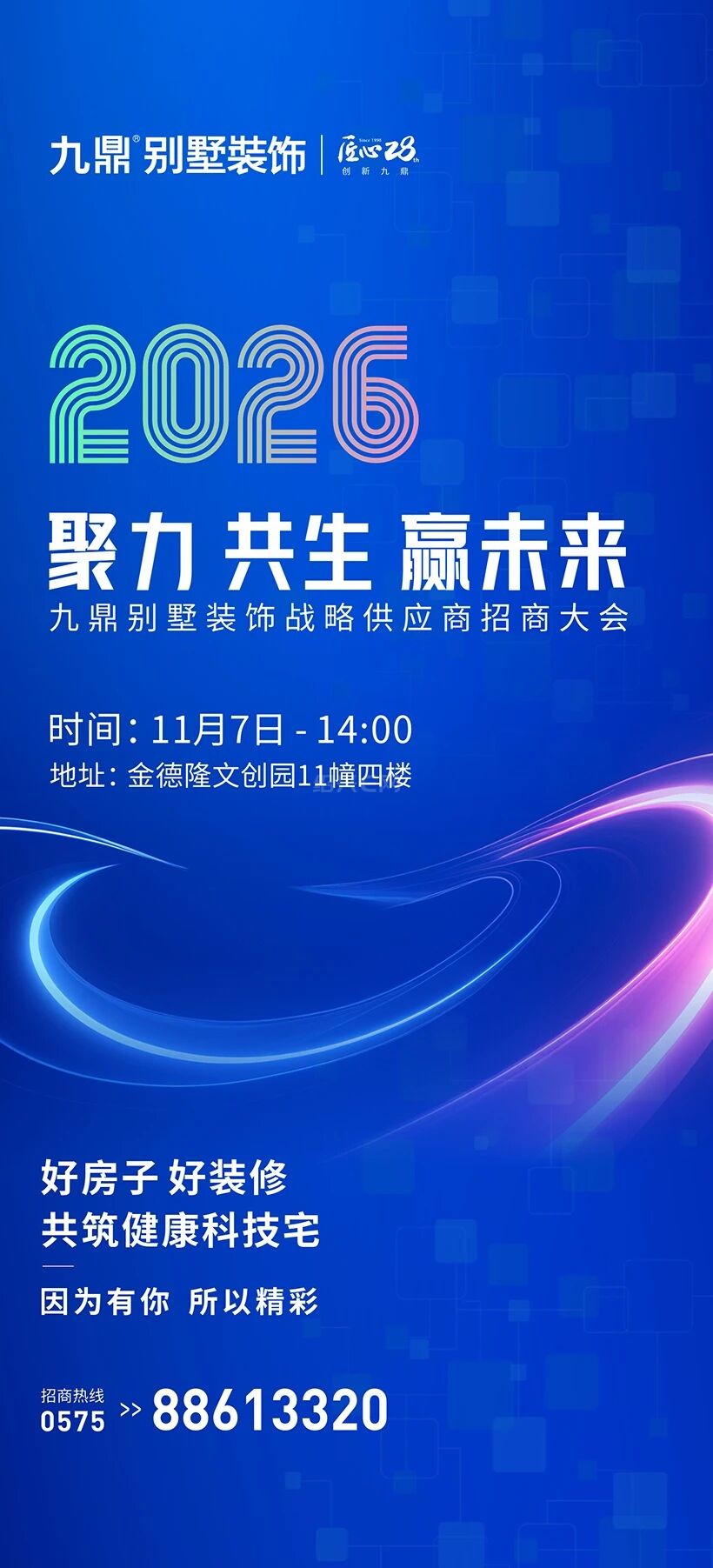 ’当时代的风潮指向绿色与智能,当家的定义超越栖身迈向身心的滋养,一场关于未来居住的变革正在发生。在此,我们诚挚地邀请与九鼎价值观同频、与时代脉搏共振的您,莅临【九鼎别墅装饰2026年度战略供应商招商大会】,与我们一同擘画蓝图,携手开启高端家居的新篇章。