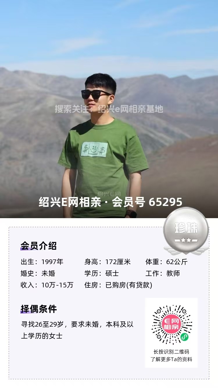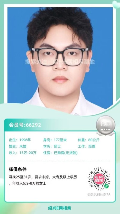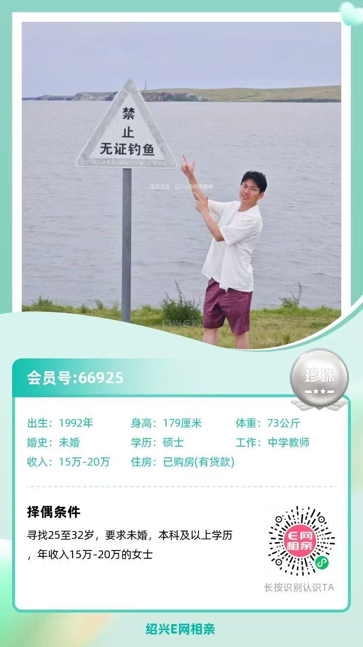 92年越城小哥哥,身高179,外形阳光。独生子,硕士学历,中学教师,年薪15-20万,房车俱备。