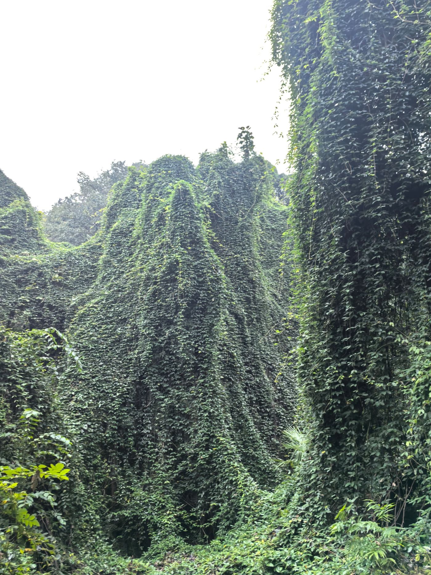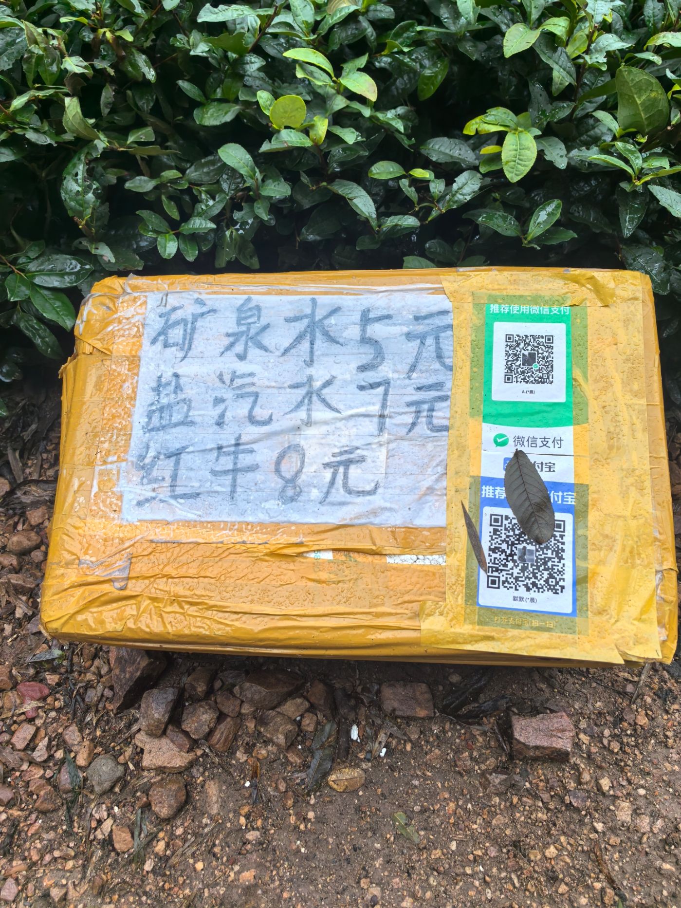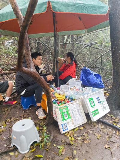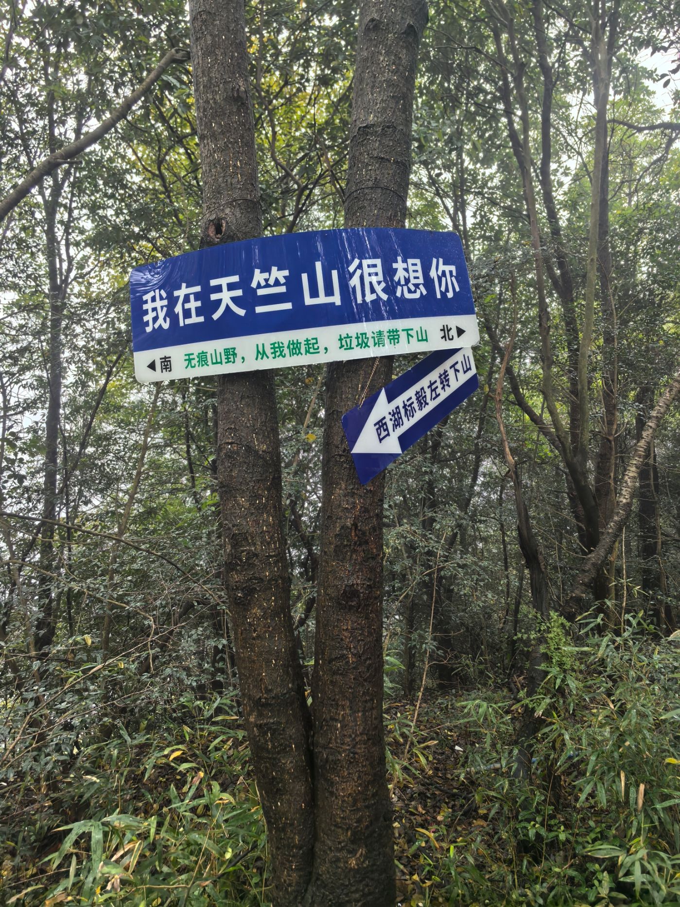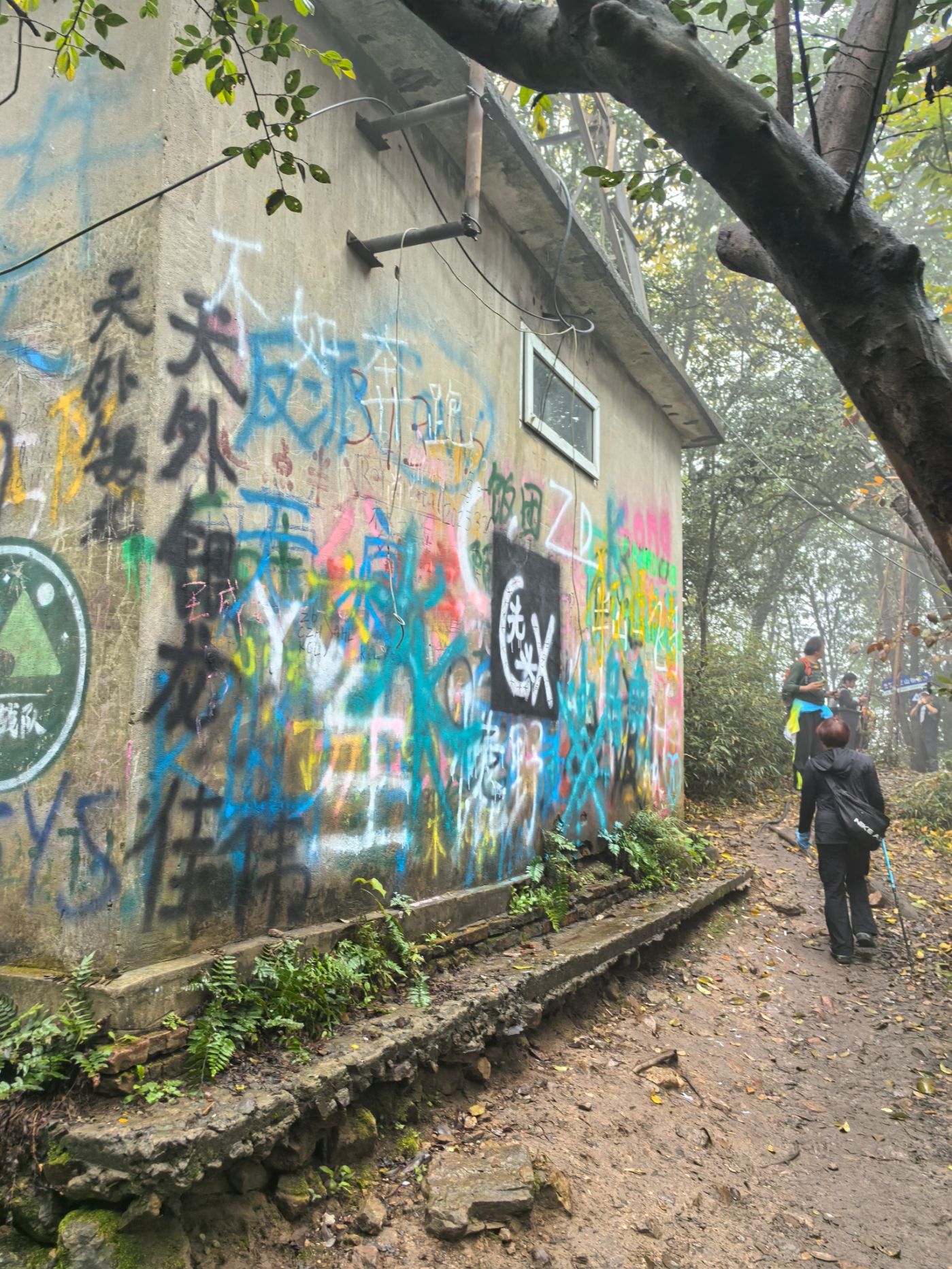 接下来的这段野山路,是标毅线中最为崎岖陡峭的。我只低头专注于脚下泥泞的山路,紧跟着队伍向上攀爬。10点20分,我们成功登顶天门山。山顶有一座墙面被涂鸦成五颜六色的水泥小屋,是“标毅线”的一个经典打卡点。天门山又叫天竺山,是西湖群山的最高点,海拔412米。但因山顶树木茂盛视野受限,并没有一览众山小的感觉。山顶还有一处卖饮料的摊点,矿泉水6 元一瓶,价格岁不便宜,但考虑到运输不易,价格也算合理吧。