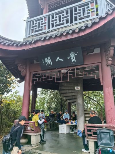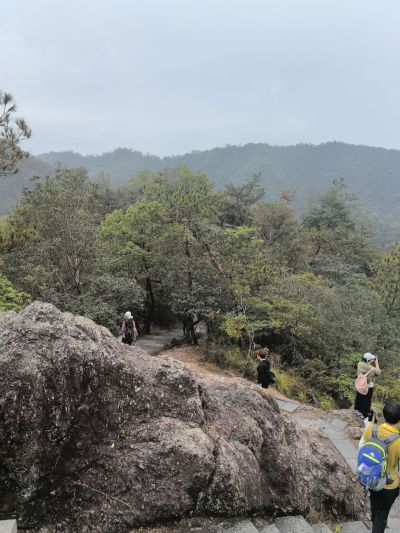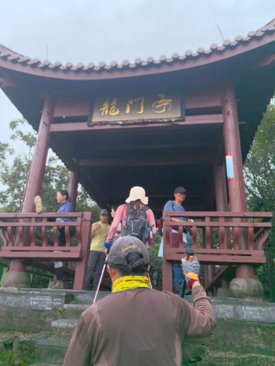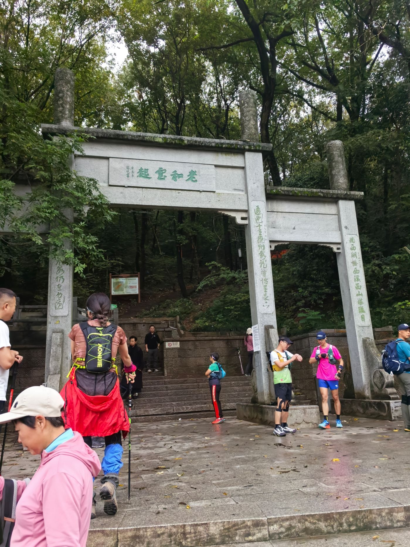 继续前行,来到一处三叉路口:往左上可达北高峰,往右下则可至法华寺。如果要去北高峰游览,也可以左转到北高峰山顶,之后再原路返回。北高峰顶有“天下第一财神庙”,可以祈福。站在北高峰观景平台,还能尽揽西湖全景,是一处绝佳的风景点。我选择沿主路继续向美人峰方向前行。上午9点,抵达“龙门亭”,稍作休整。一路上,走标毅线的“驴友”络绎不绝,最令人惊叹的是那些“跑山大神”,他们在山间快速穿梭,如履平地。我遇到一队与我徒步节奏相仿的杭州本地驴友,便默契地紧跟在他们后头,权当就搭了趟“顺风车”。