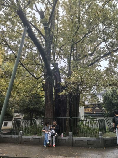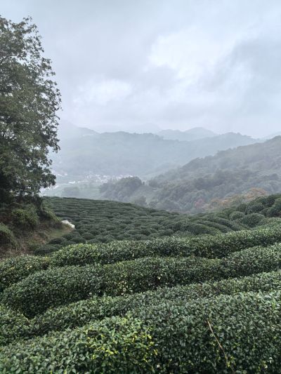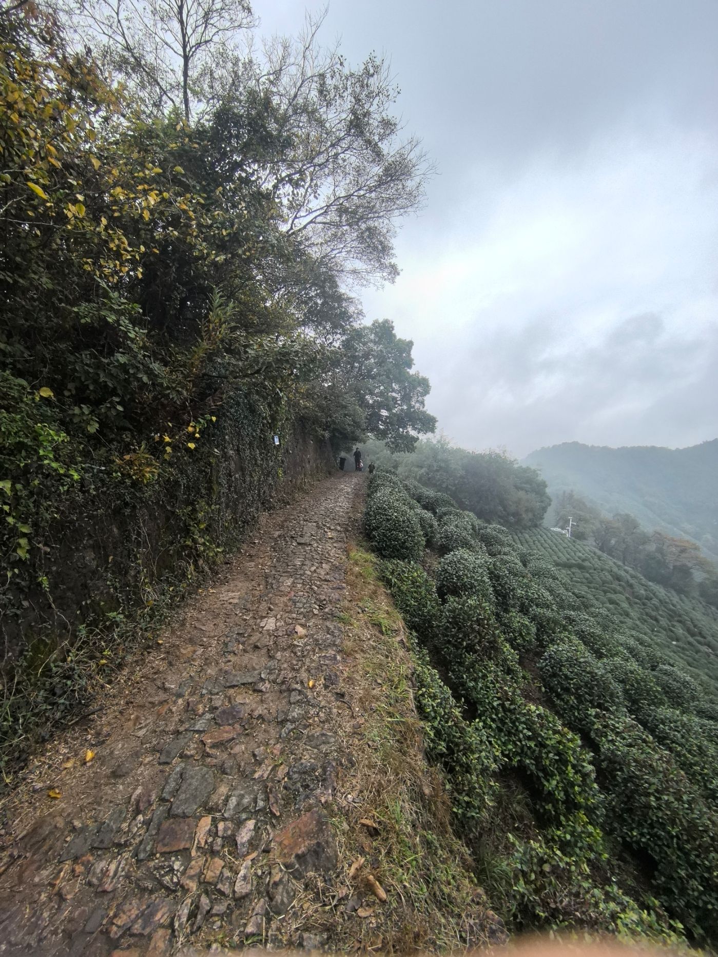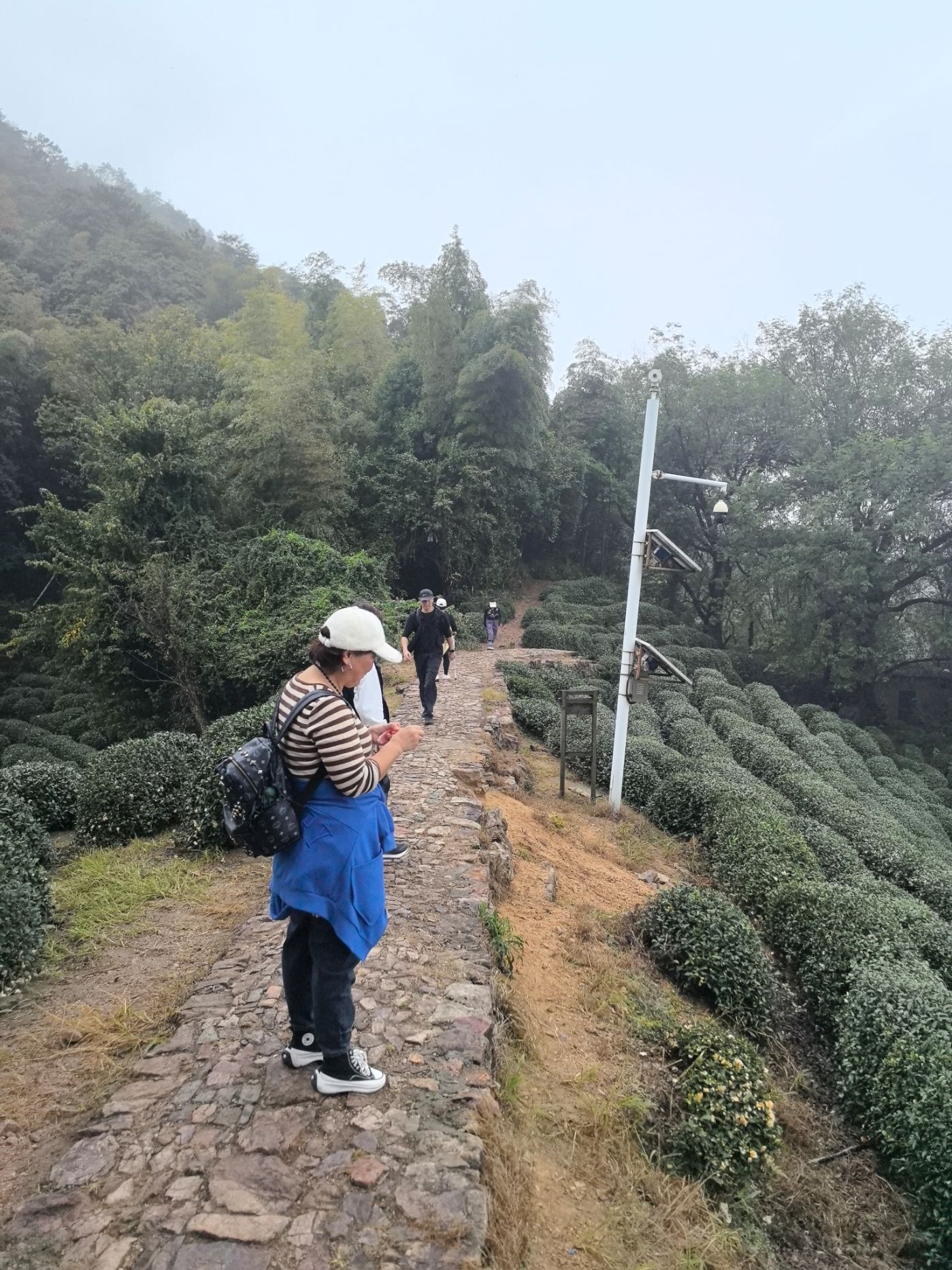 中午11点30分,我们抵达五云山顶的真际寺,这里有卫生间、小卖部和凉亭,可供游客休憩。寺门槛外有株千年银杏树,银杏叶半黄半绿,吸引少游客拍照打卡。稍作休憩后,我们在三岔路口左转下行(直行是通往云栖竹径),先走一段石台阶路,然后再向左拐入野山路(留意树稍上挂着的标记就能找到入口)。这段路难度适中,但在一处与茶园连接的斜坡处要格外小心。走过这个斜坡,就是一片地势低洼的茶田,非常好走。
