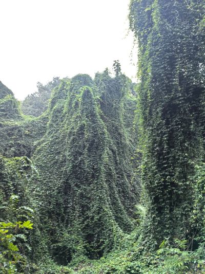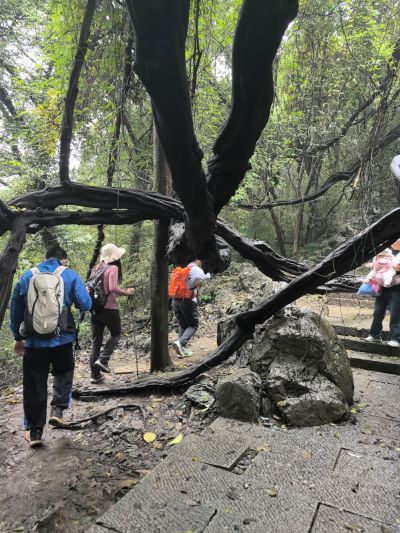 沿着村中一条马路走到底,就进入一片小山坡,这里也是一小片茶园。约15分钟后,走上了一条石头路面的宽阔马路,这里是玉皇山的盘山公路。沿着这条公路往左再走十分钟,看到路边通往玉皇山顶的指示牌后就向玉皇山顶前行。途中会经过几条盘根错节的千年老藤,这也是标毅线的经典打卡点。跨过老藤,沿着石板路面先上后下,就来到了“节义亭”凉亭。见到这个亭子,也就意味着可以跟野山路告别了。