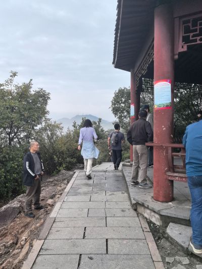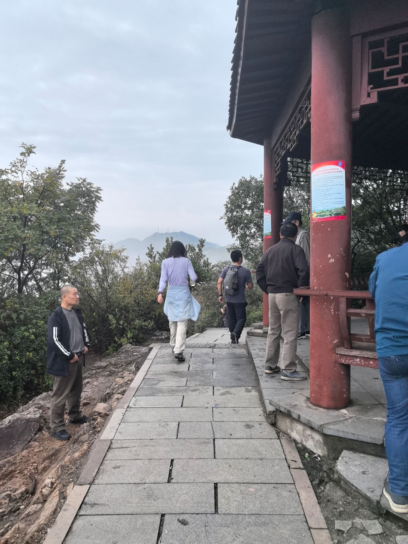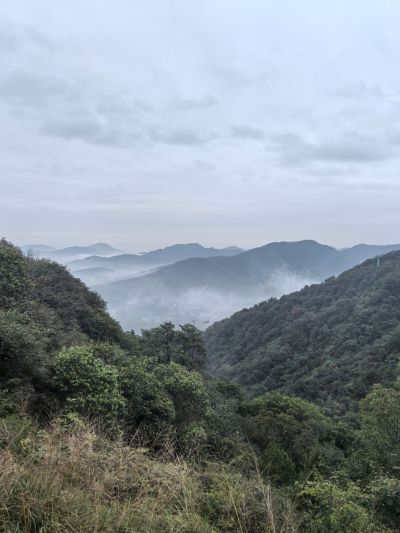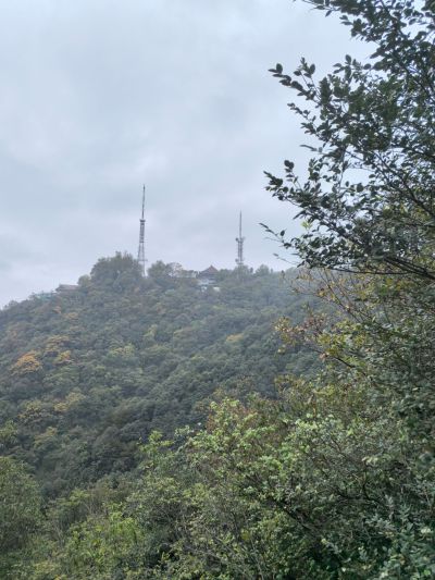 7点46分左右,我登上老和山山顶的凉亭。再往前走一小段路,是另一座叫“秦亭”的凉亭。两座凉亭里有不少晨练的老人,估计是居住在附近小区的居民吧。站在这里向左前方远眺,杭州市区繁华的都市景象尽收眼底。接下来的一段路是沿山脊线延伸的游步道,地面铺着石板,走起来颇为轻松惬意。途中有一处向左下撤的小路,可以通往杭州植物园、浙江大学。站在山脊线上放眼远望,层峦叠嶂间云雾弥漫,北高峰上的两座信号发射塔清晰可见,浑厚古朴的钟声自北高峰山顶传来,在山谷间悠悠回荡——那是游客在撞钟祈福。