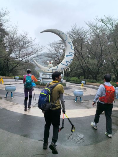 短暂休息后我们继续前行,接下来是一段下山的石阶路。俗话说“上山容易下山难”,诚不欺我。上山只是累,但下山时腿部肌肉与膝盖都承受着更大压力。随后又是一片茶园,茶园角落里还有一处矿泉水取水点,有市民拿着大容量塑料桶在取水。我也用喝剩下的空瓶子接了一瓶水,立马省下了 6 元钱,暗自窃喜。下午 1 点 33 分,我们到达儿童公园。儿童公园的广场里立着一座巨大的月亮造型雕塑。从儿童公园检票口出,过马路便是烟火气十足的满觉陇村,路旁餐馆林立。