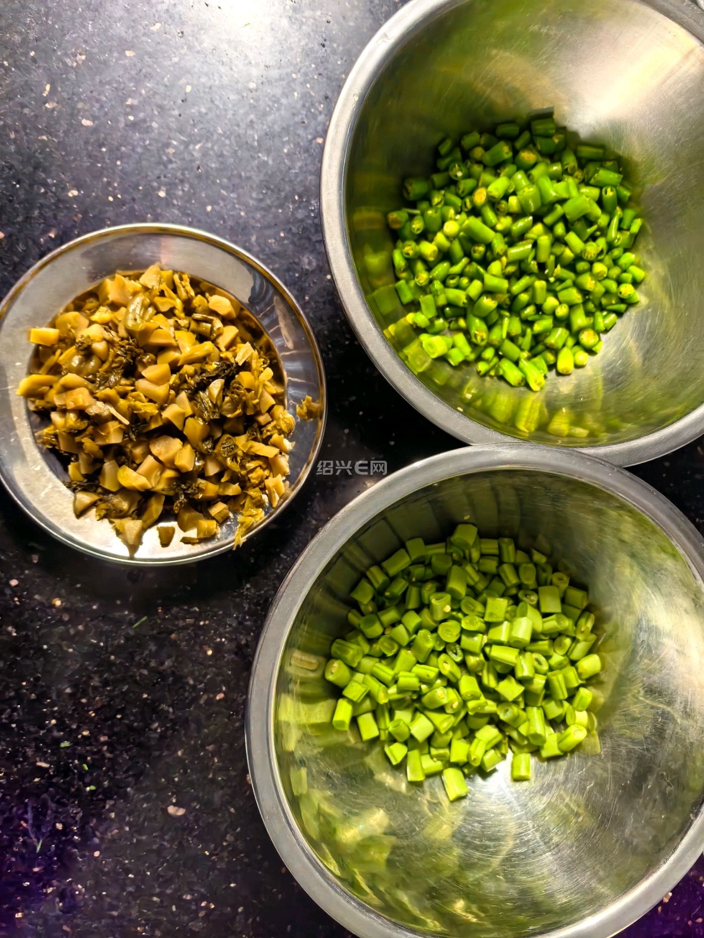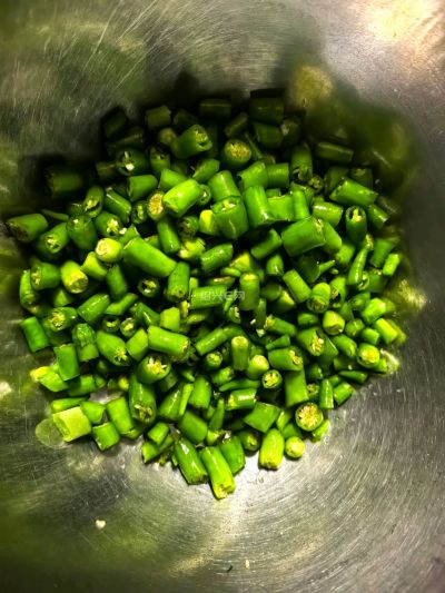 不知为什么,今年农户自种的小辣椒嫩小的买不到,因此辣椒、四季豆和榨菜脑这炒三丁一直弄不起来。