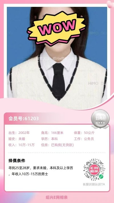 独生女,本科学历,公务员,绍兴有房有车无贷款。父亲国企工作,母亲经商,均有退休金和医保,家境殷实。