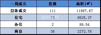 据绍兴市房地产信息网的统计数据显示,11月17日至11月23日绍兴市越城区商品房成交111套,成交面积11897.67平方米。各类商品房中,商品住宅成交73套,成交面积为9525.37平方米;办公地产成交2套,成交面积为99.54平方米,商业物业成交36套,成交面积为2272.76平方米。