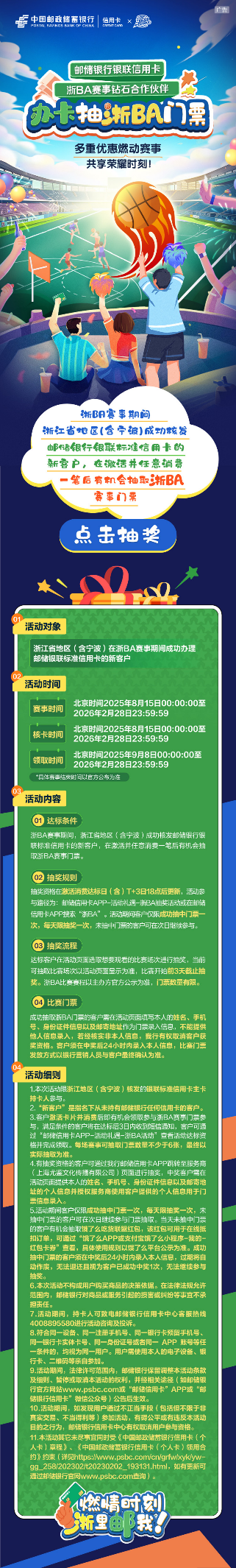 办邮储银行柯桥区支行信用卡,一张卡搞定观赛+出行+美食!邮储信用卡周六五折,天天立减!高铁卡享无限次出行权益!办卡抽浙BA门票直击精彩赛事!活动详情见邮储银行信用卡APP。