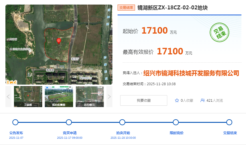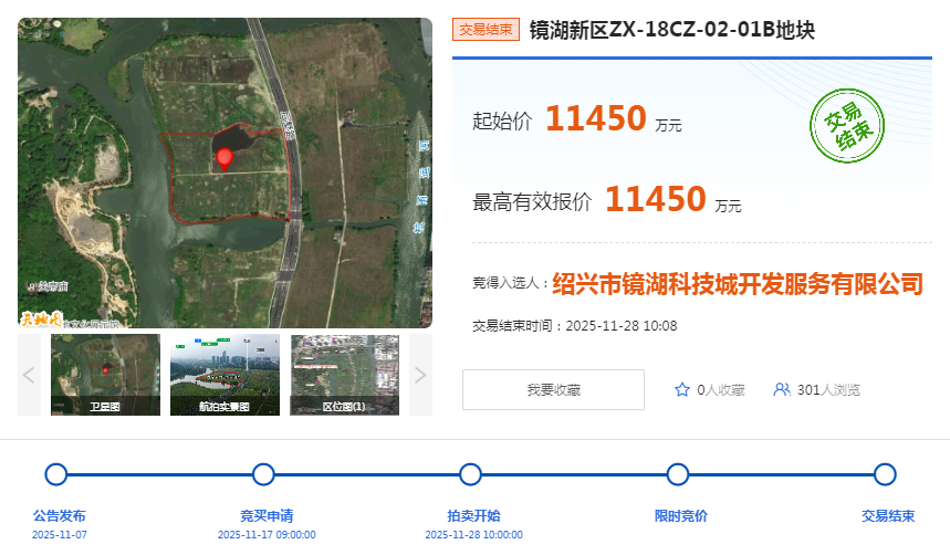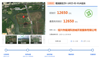 【土拍】镜湖3地块均底价成交!由绍兴市镜湖科技城开发服务有限公司竞得