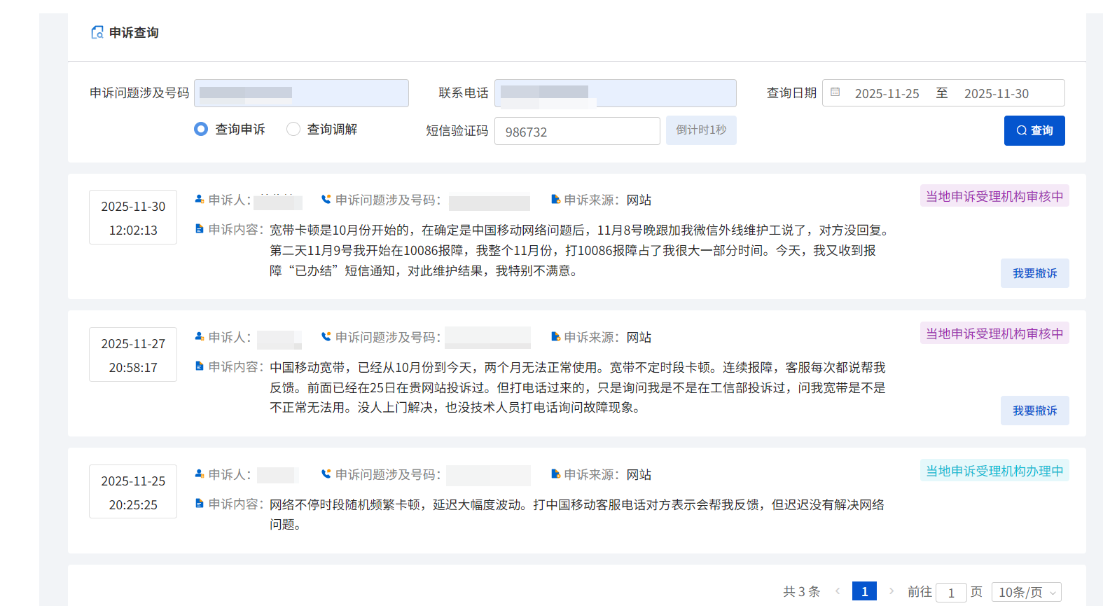11月25日工信部投诉,他们第二天来了,我以为是工信部当晚转当地相关部门,给他们打了电话,结果,今天突然收到广东省的电信部门短信,我才知道25号的投诉,5天后才到广东。