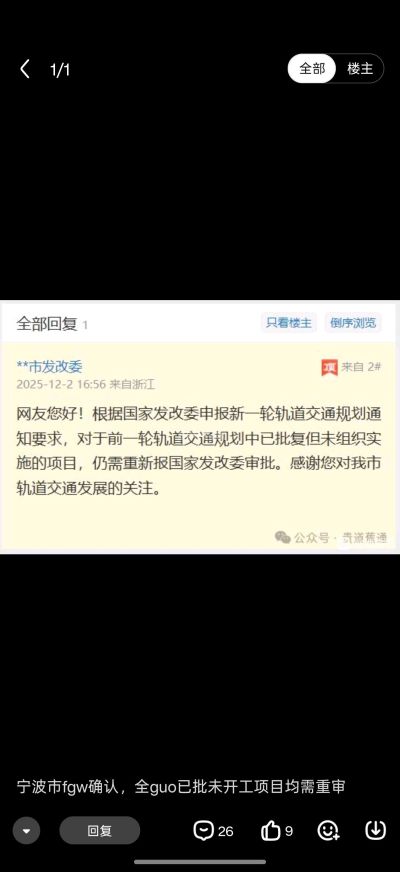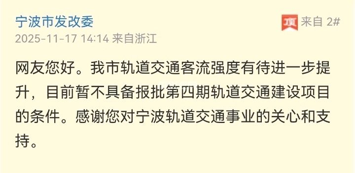 你知道这条回复回的是什么吗?!是已批复的线路因为没开工,要重新走报批流程。我说的早先是宁波四期因为客流不合格,批报不了……你真是关注地铁都不知道关注了啥
