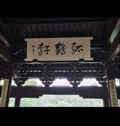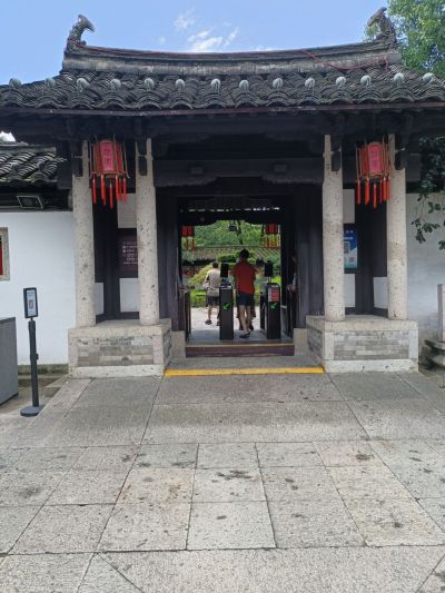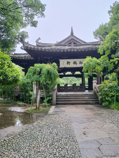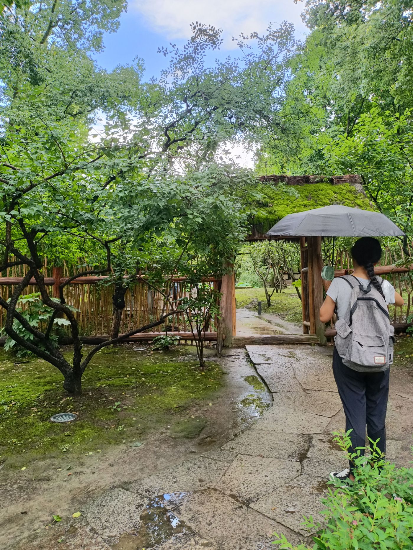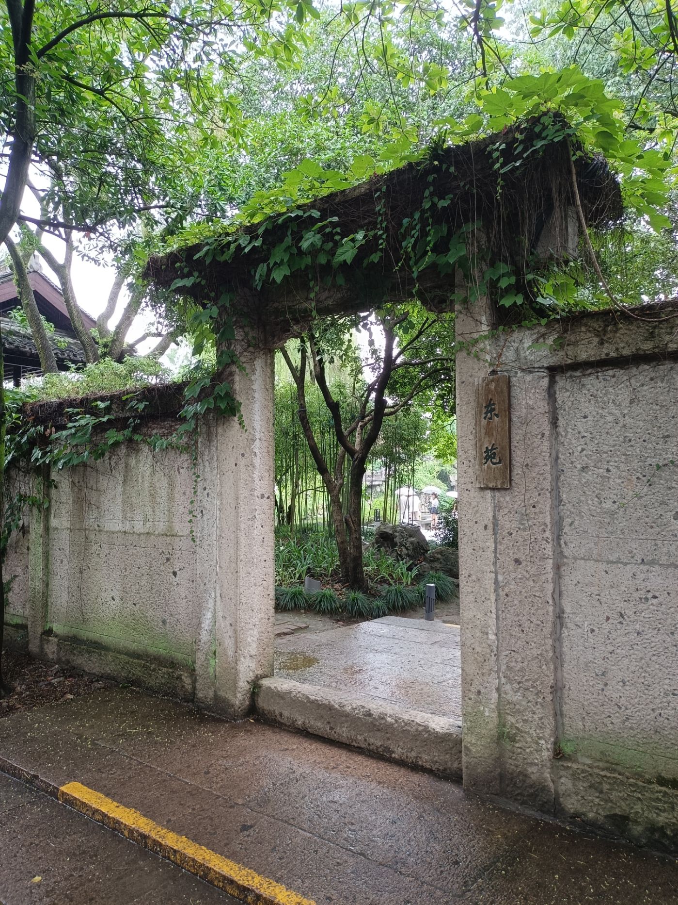 我从右边转入曲径小道,跨过潺潺小溪,便看。‘一扇草门。草门以厚草为瓦,草上绿苔斑斑,田园气息油然而生。此时,天空飘起小雨,雨丝更添几分凄凉。踏入草门左转,便是带有古韵的“问梅槛”景点。旁边有几株老梅,只是盛夏无梅可赏,倒是一旁的荷塘弥补了缺憾。六月正是赏荷之时,一柱擎天的翠叶、含苞欲放的花蕾、盛开的红莲白莲,布满大半个荷塘。剩下的水域里,几只白鹅与一群灰鸭正自在游弋。
