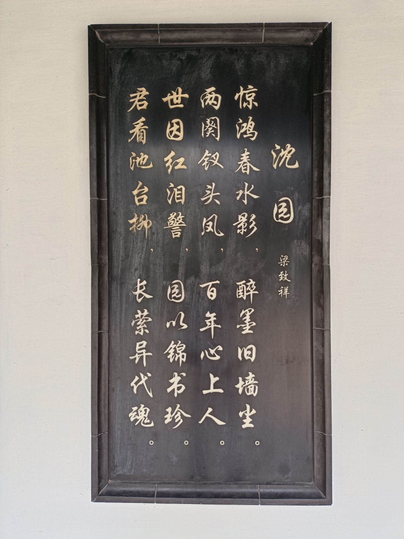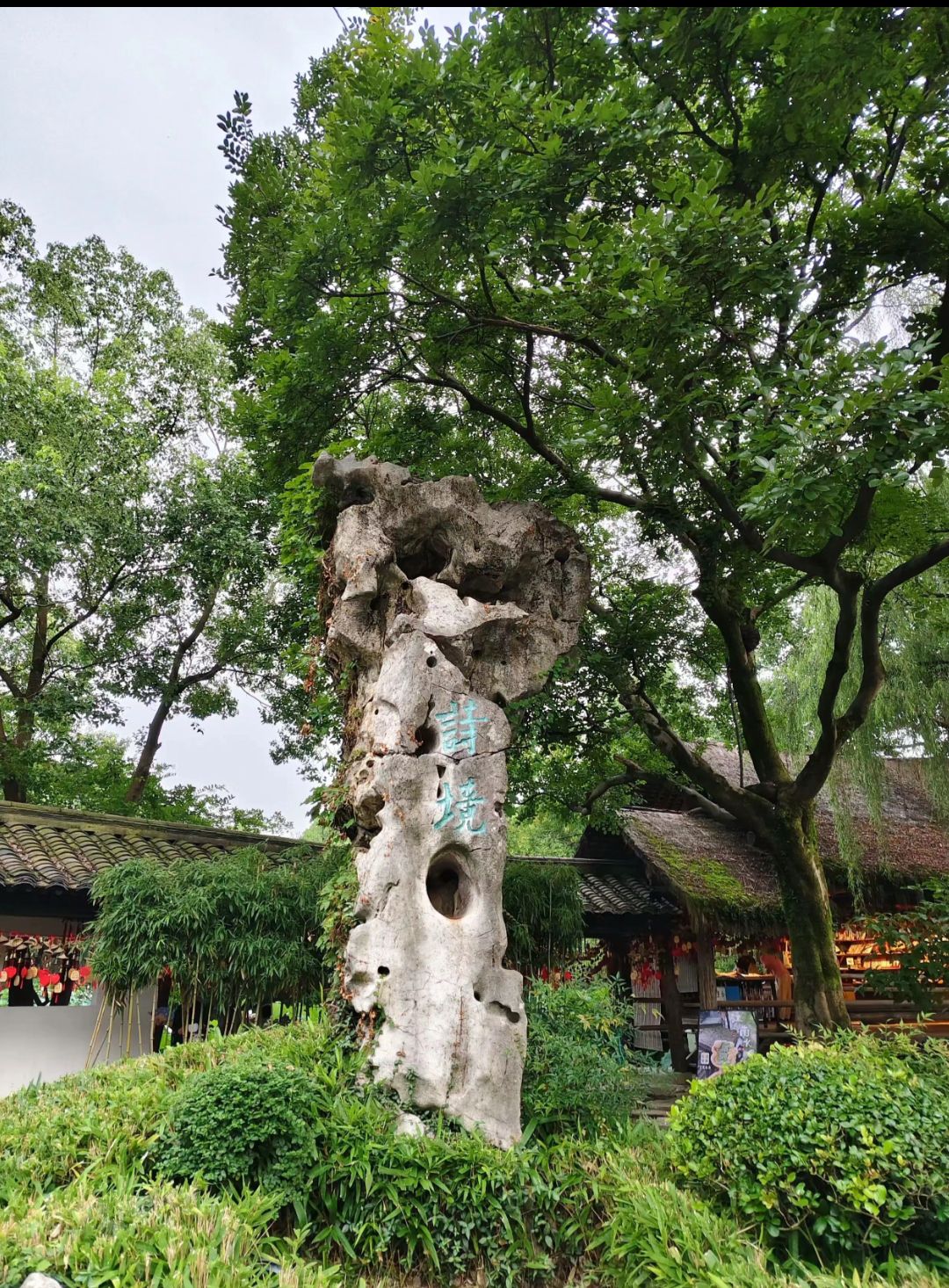 进入大门,是一片青石板铺就的场地。正面一棵枝繁叶茂的大树旁,耸立着一块高约丈许的太湖石,石上刻着“诗境”两个绿色大字。左侧廊下,十几块诗词题刻嵌在墙壁上,皆是文人雅士游园后留下的诗作,抒发着他们的感受。右侧灌木与修竹成林,林后有小溪环绕,前方用葱兰与块石作围,清雅之气扑面而来。这一切仿佛都在提醒游人,陆游与唐琬的悲情故事,以及那两首《钗头凤》词,需以《钗头凤》的诗境去欣赏园中一草一木、一台一亭,寻觅当年那场梦留下的千年遗迹。