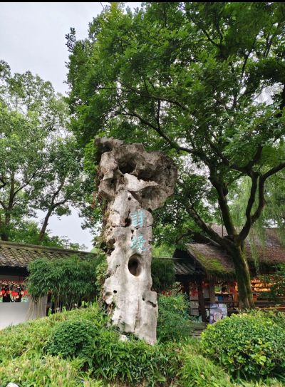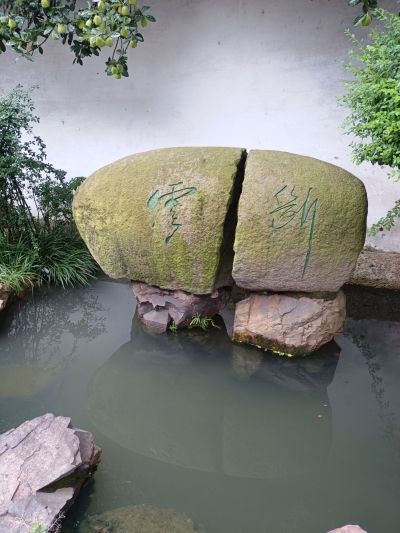 沈园位于鲁迅故里东侧,大约一站路的距离。走到沈园入口处,便看见右侧墙边有一块纵向断裂的卵形景观石,石上横着镌刻“断云”二字。思忖“断云”之意,似乎在隐隐向游人诉说着陆游与唐琬在此发生的爱情悲剧。