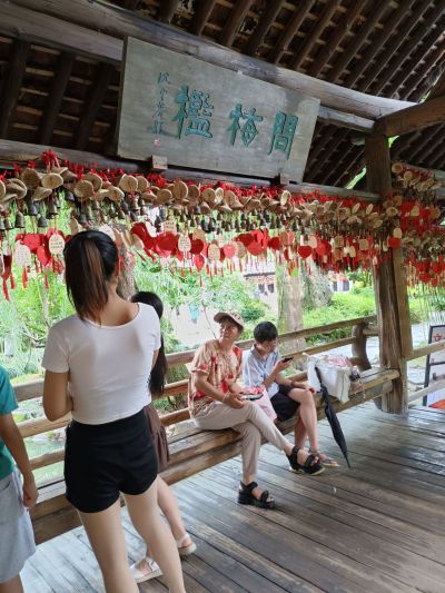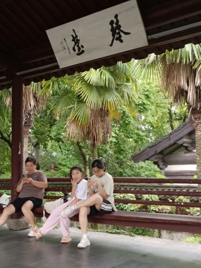 园中游客多是年轻人,有成双成对的,也有三五成群的。有的少女身着汉服,头戴簪花头饰,描着蛾眉,化着淡妆,手捧奶茶,在荷塘边漫步,在亭廊内小憩。她们游园,或许是为欣赏园林美景,或许是想展示青春亮丽。对于陆游与唐婉的哀怨故事,她们并不关注,也不去体味诗中意境,在她们心中,这些故事已如历史的烟尘。