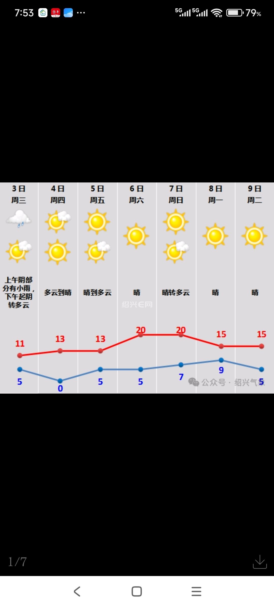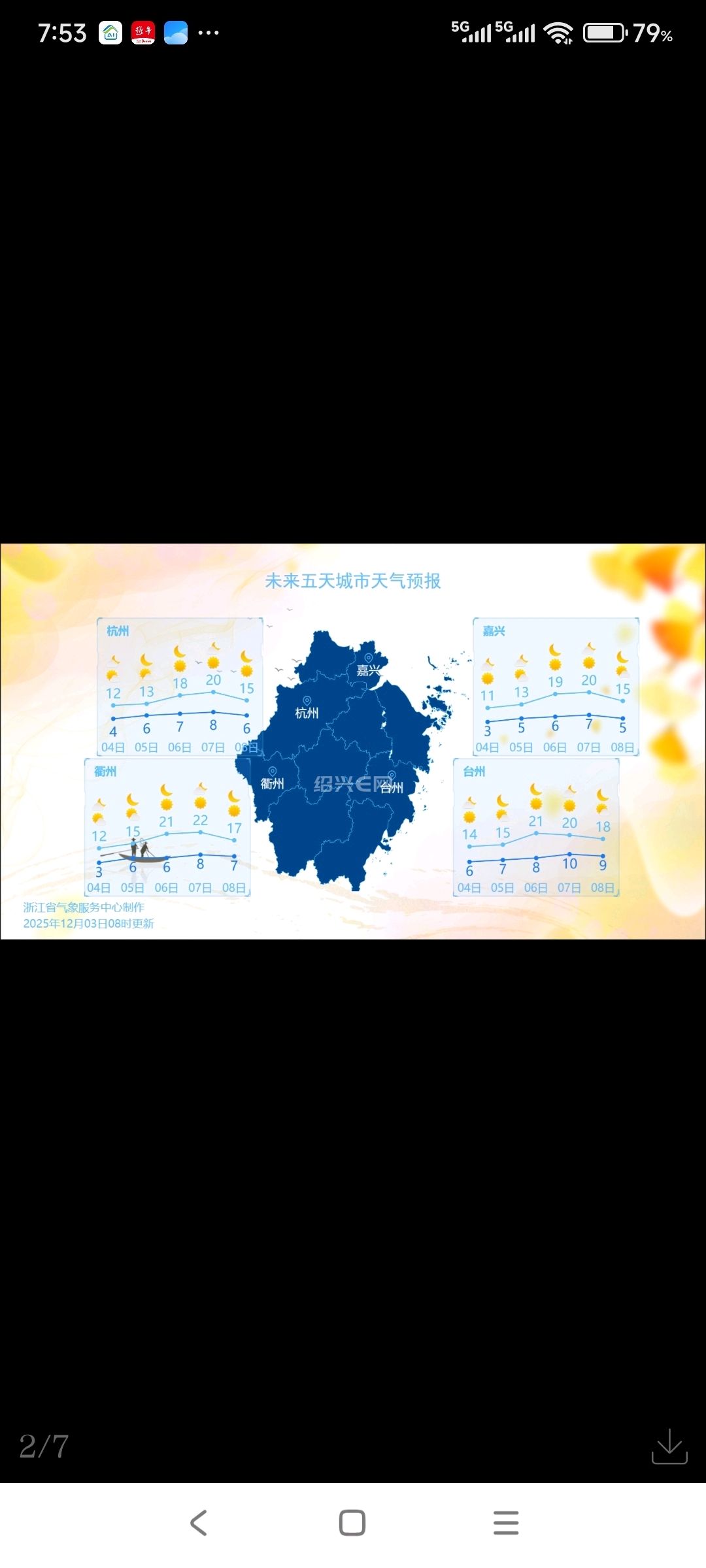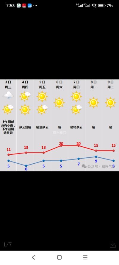 绍兴市气象台2025年12月4日6:00发布的短期天气预报:今天多云到晴,明天晴到多云。偏北风2~3级。今天最高气温:11~13℃,比昨天偏高2℃左右。明天最低气温:5~7℃,山区2~4℃,有霜,比今天偏高5℃左右。后天晴5~20℃。