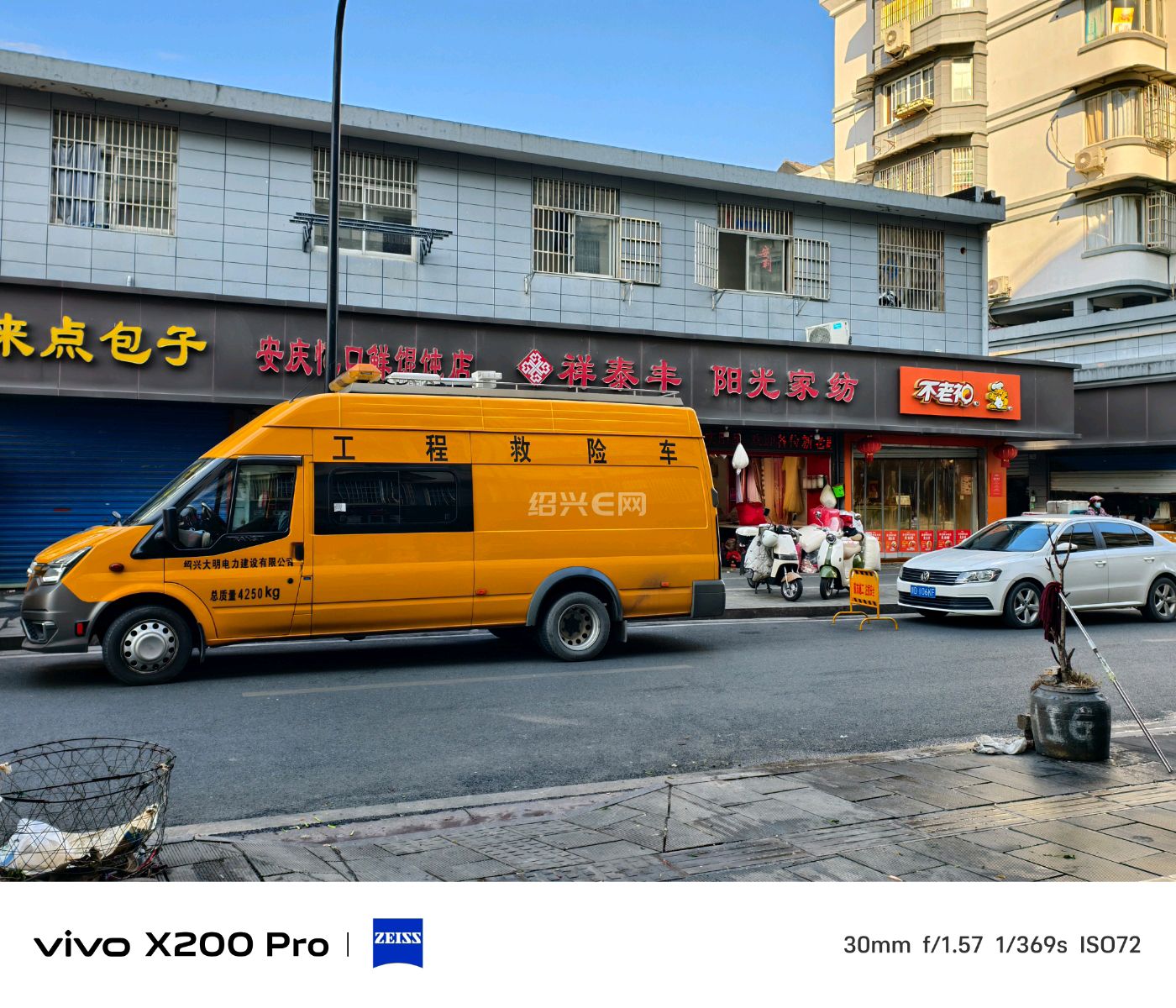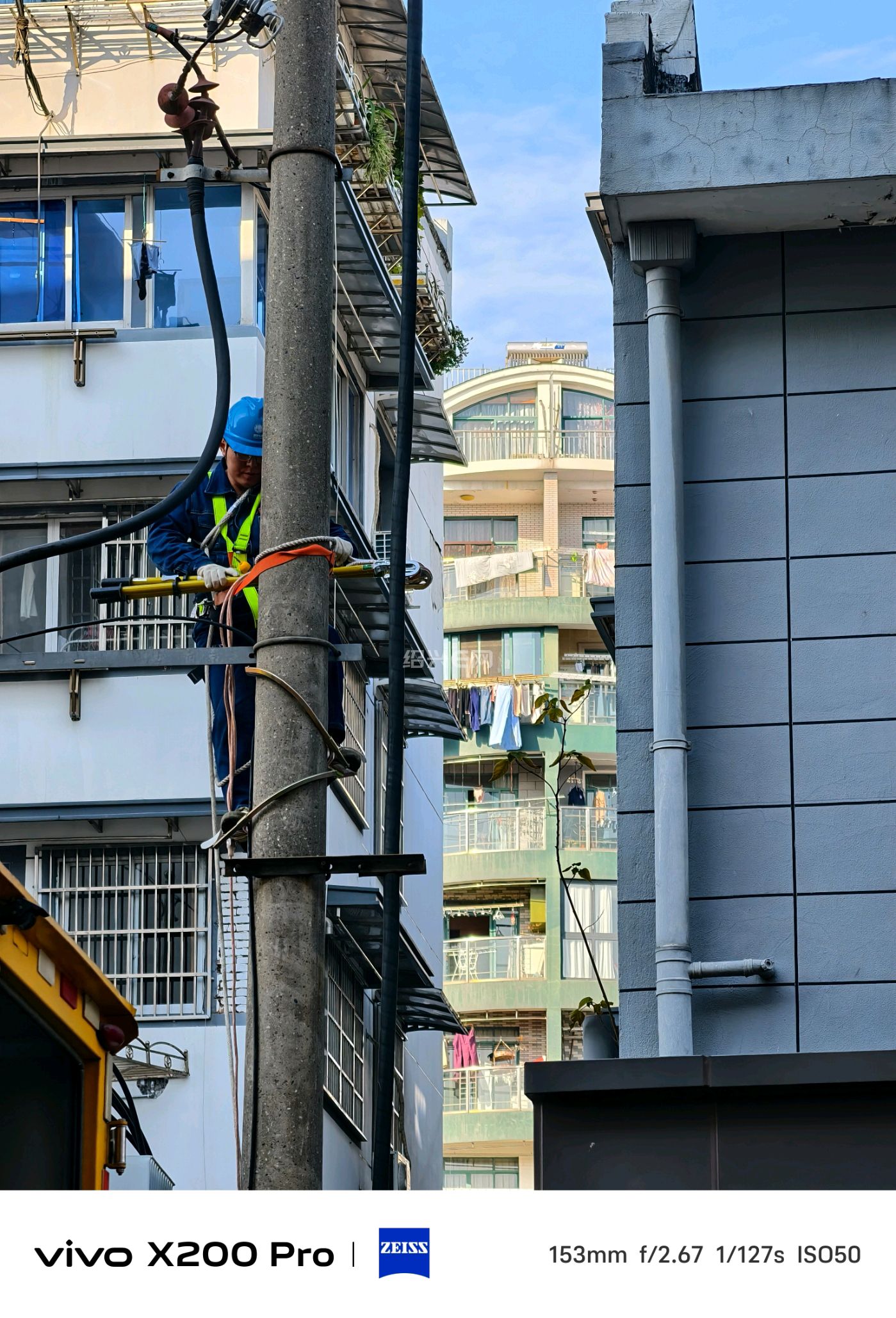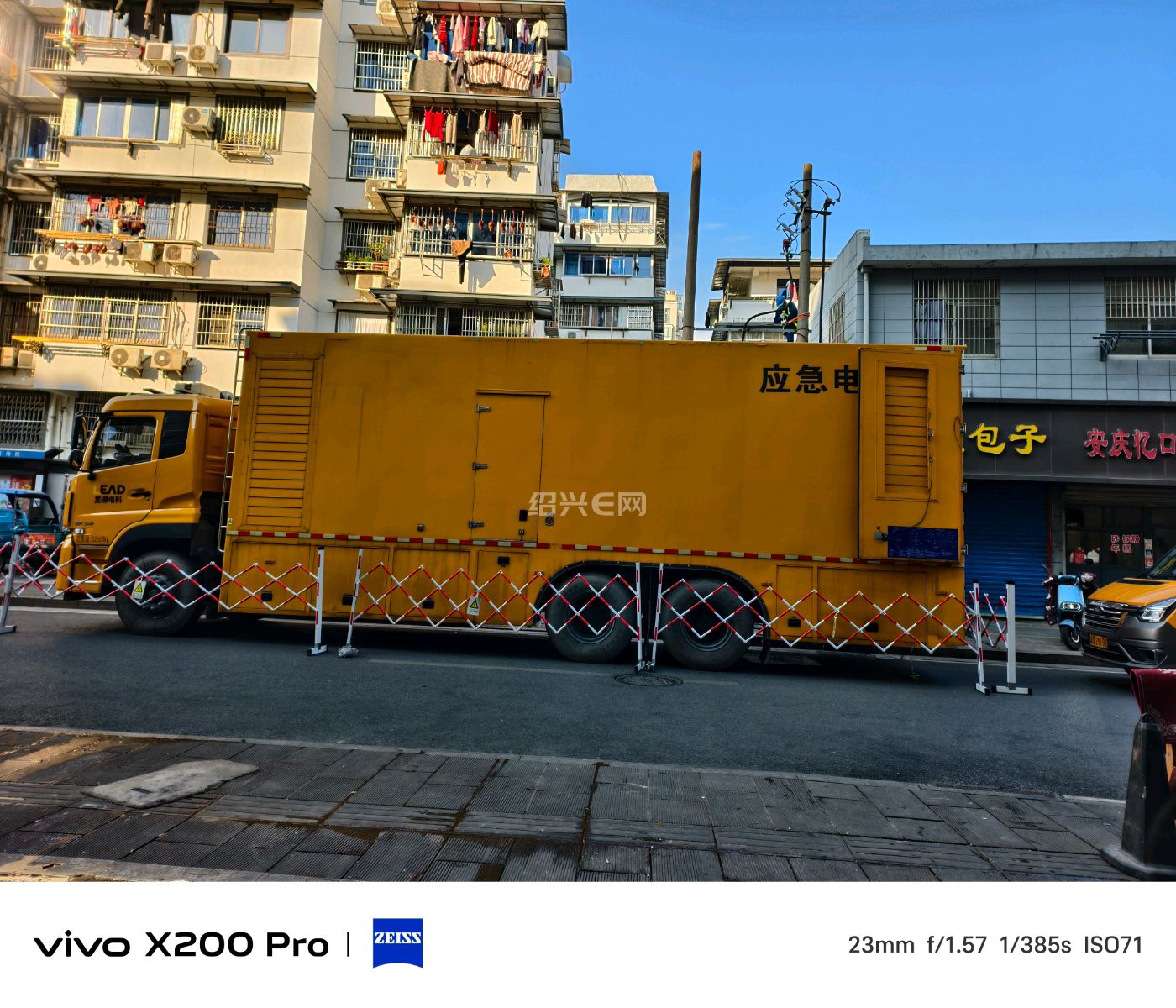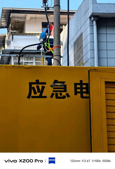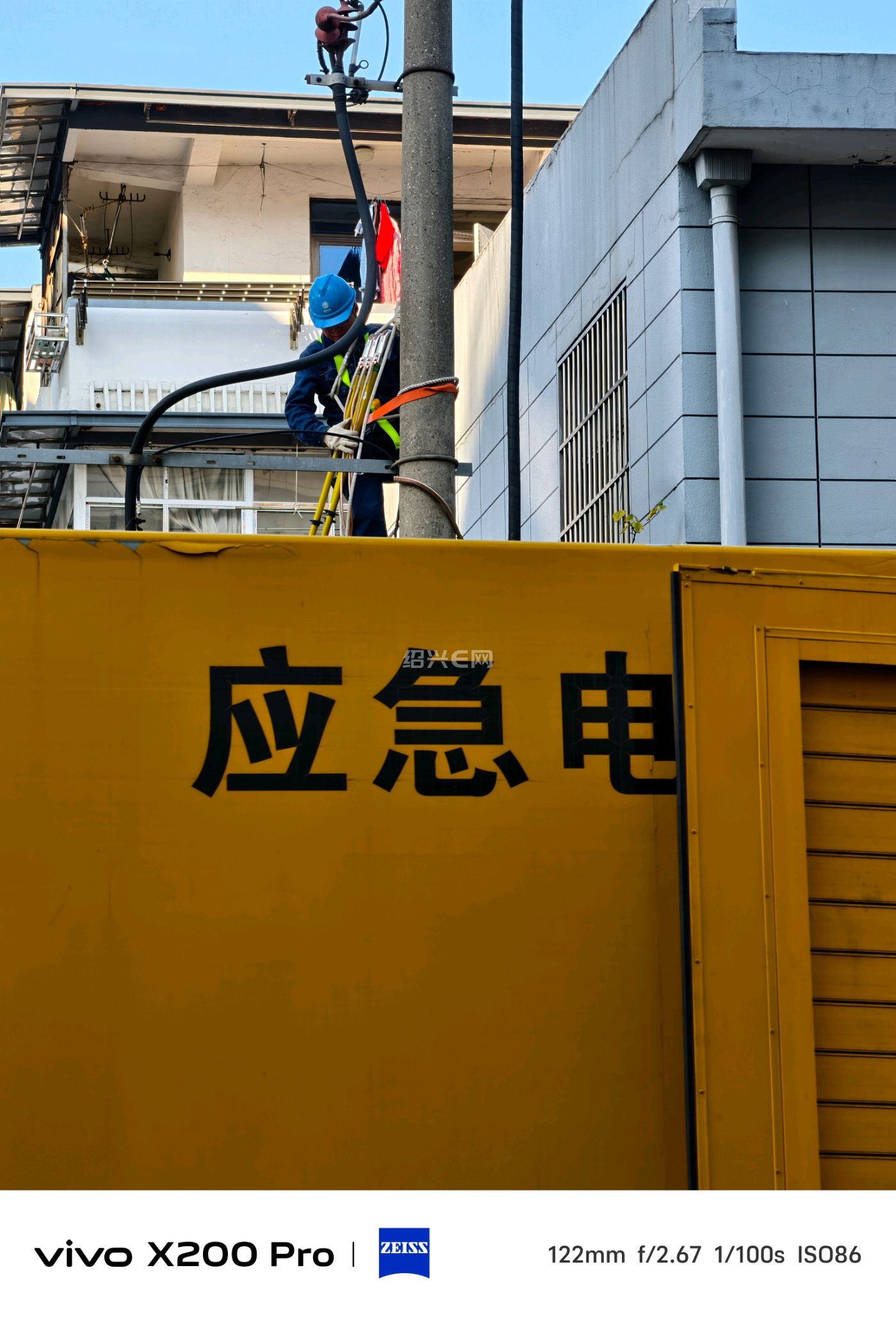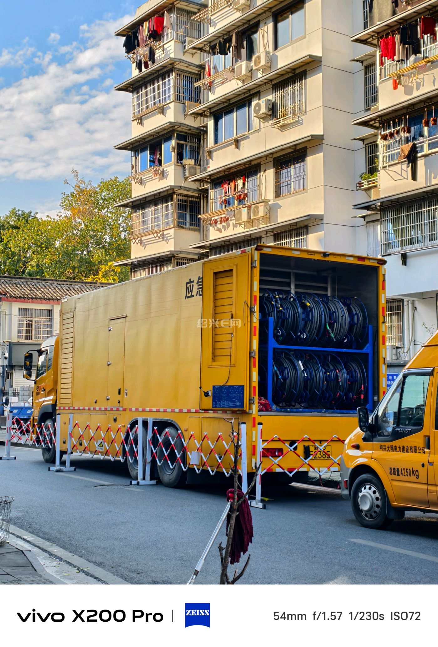 白马路上两辆应急工程抢险车停着,电路抢修人员爬高在紧急抢修电路。