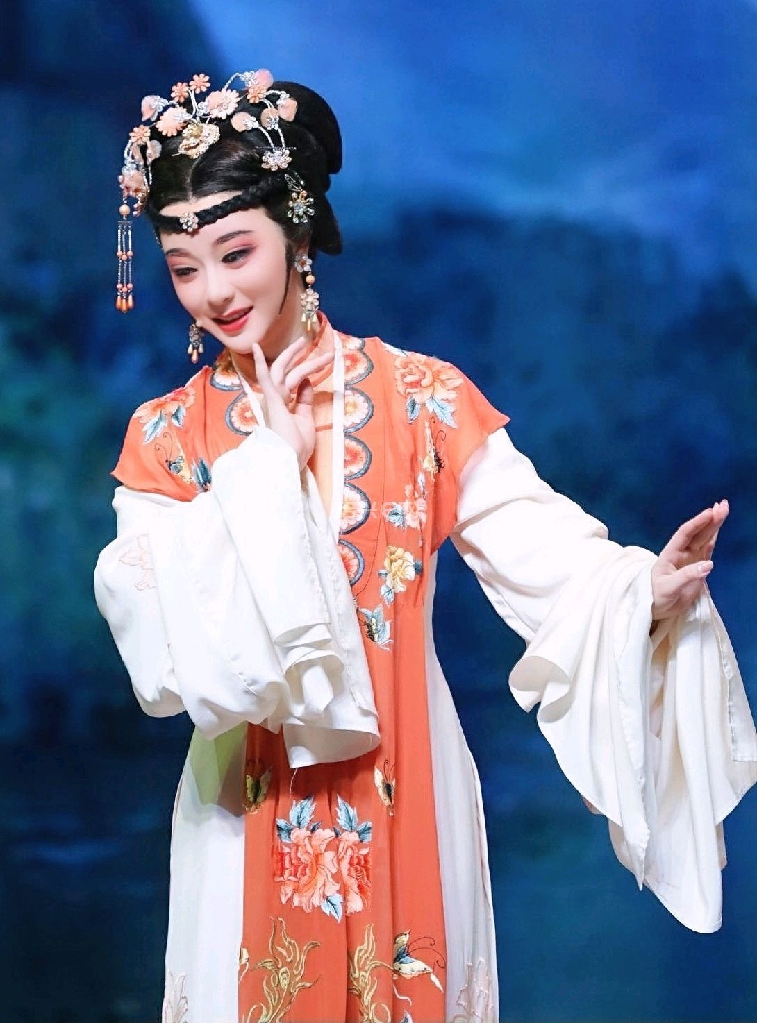 清水出芙蓉,牡丹吐芳香……王静是浙江小百花越剧院优秀花旦演员,她主攻袁派,同时兼演多种旦角流派,毕业于浙江艺术职业学院。越剧袁派的唱腔以情感表达为核心,强调内在的真实感,通过质朴平易的旋律和委婉细腻的润腔,传递深沉含蓄的情感表达,从而形成醇厚的韵味,并首创了越剧主腔“尺调腔”。王静的唱腔特具清脆明亮的音色,宽厚圆润的音韵和清新流畅的音调,并兼具袁派的细腻华彩与竺派的柔糯甜润之风格,唱腔中还融入小生儒雅英姿的风韵。