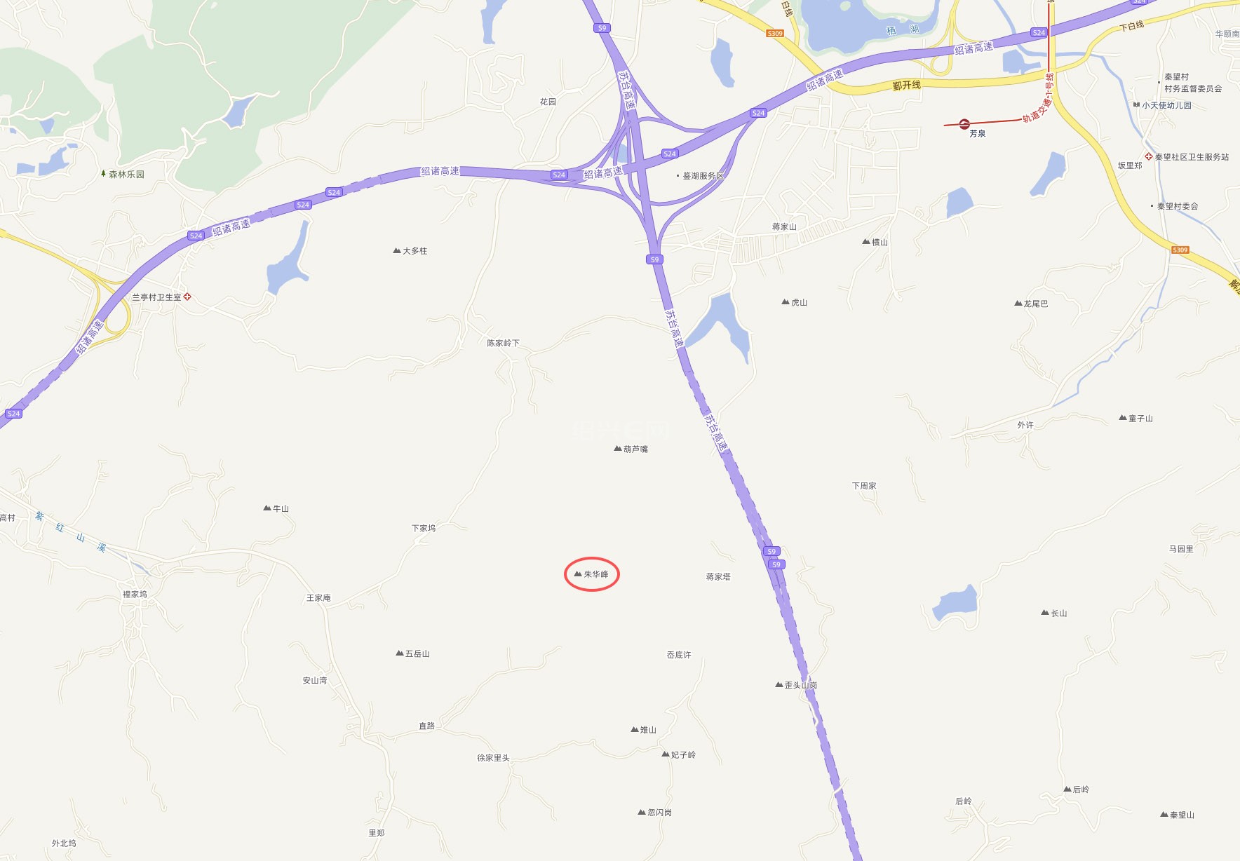 陈桥驿的文章里,朱华山坡塘江和兰亭江的分水岭。这样是不是容易找了?