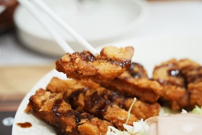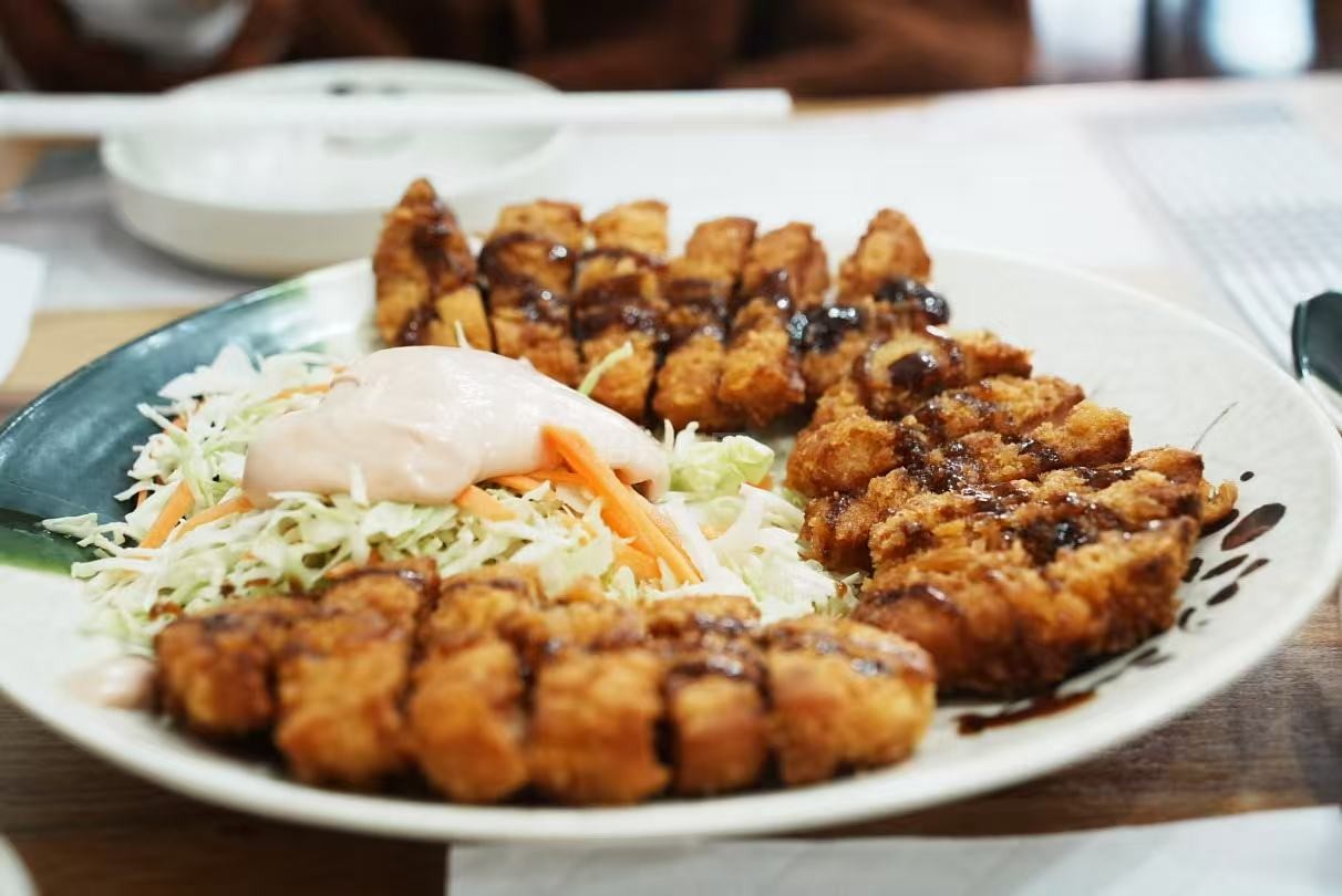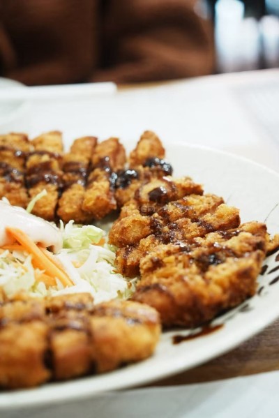 猪排夹着硬硬焦焦地还以为是回锅猪排,实际内里有肉汁又嫩;不一会儿就和朋友吃完了。