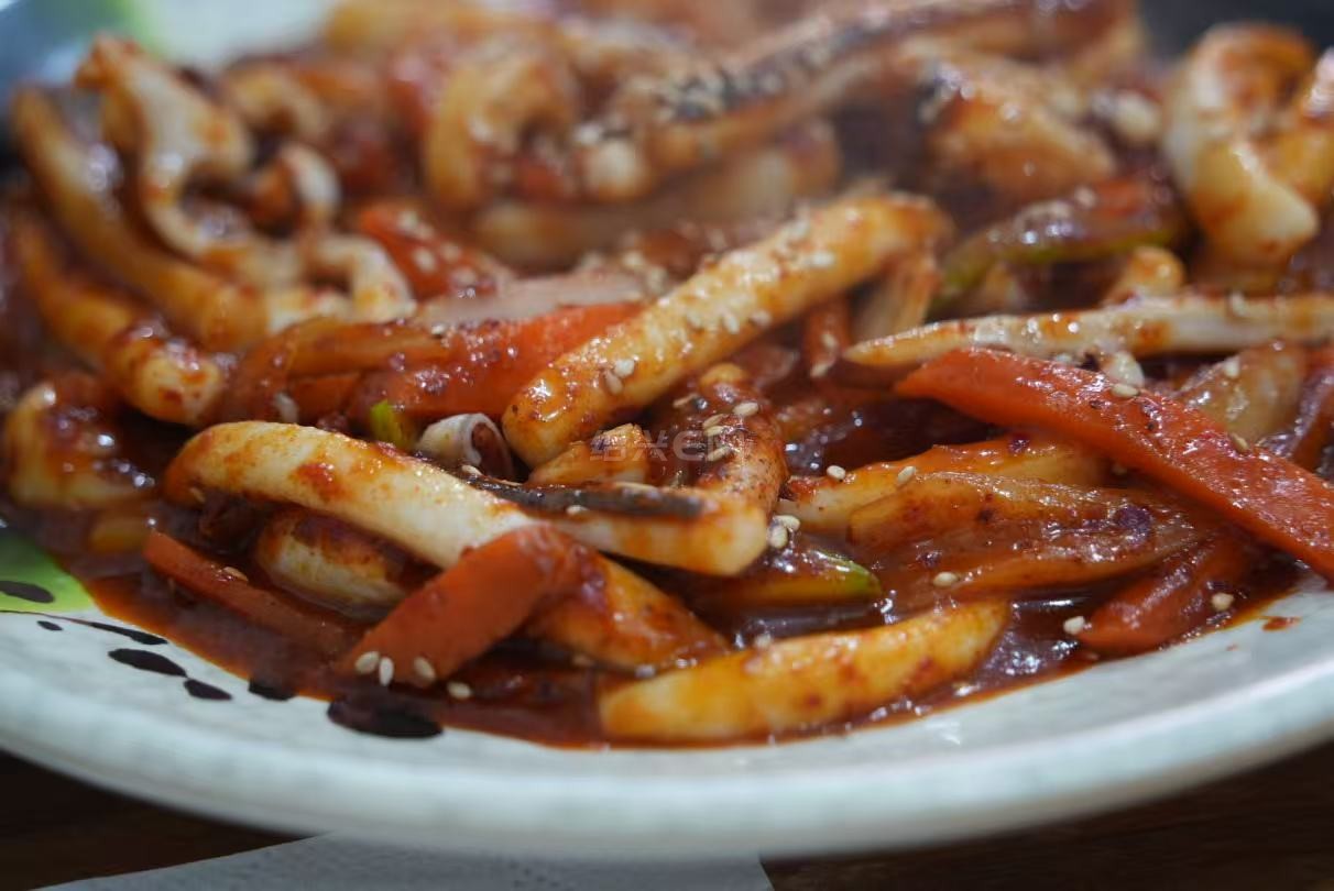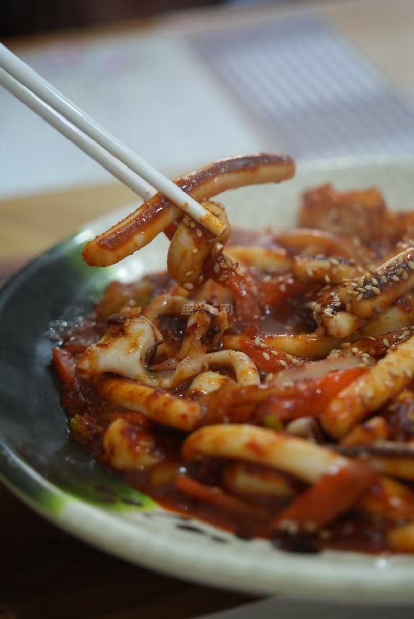 他家调制的辣炒酱料ok,鱿鱼新鲜度在线是可以白灼的程度;完胜!