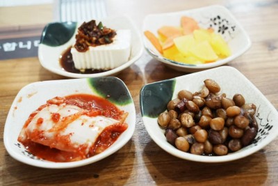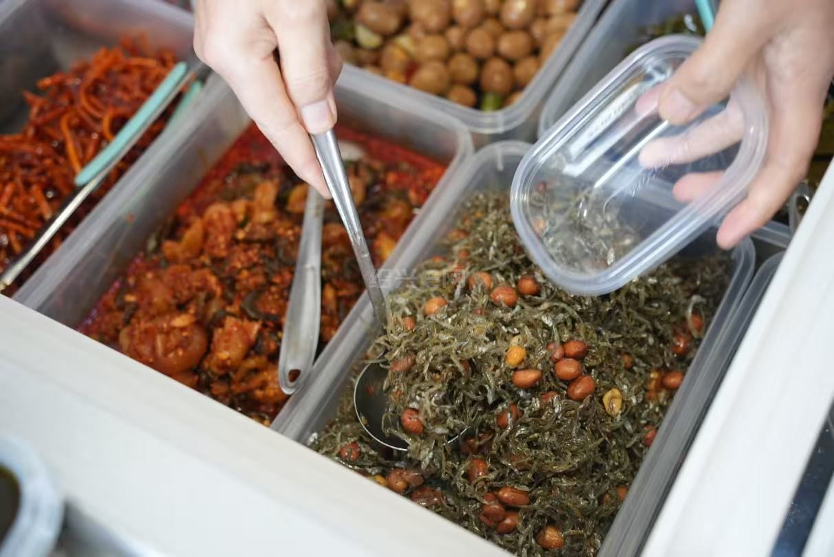 小菜是泡菜、花生、豆腐和大根,花生硬