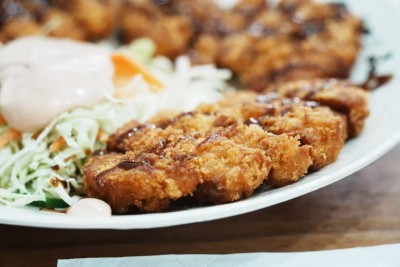 炸猪排是3块成一份,配了包心菜丝;酱料是千岛酱+沙拉酱。