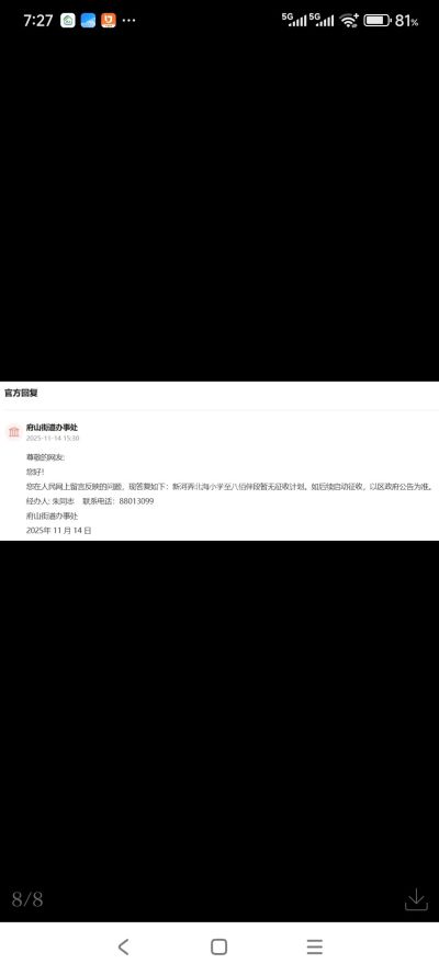 答:新河弄北海小学至八佰伴段暂无征收计划。如后续启动征收,以区政府公告为准。