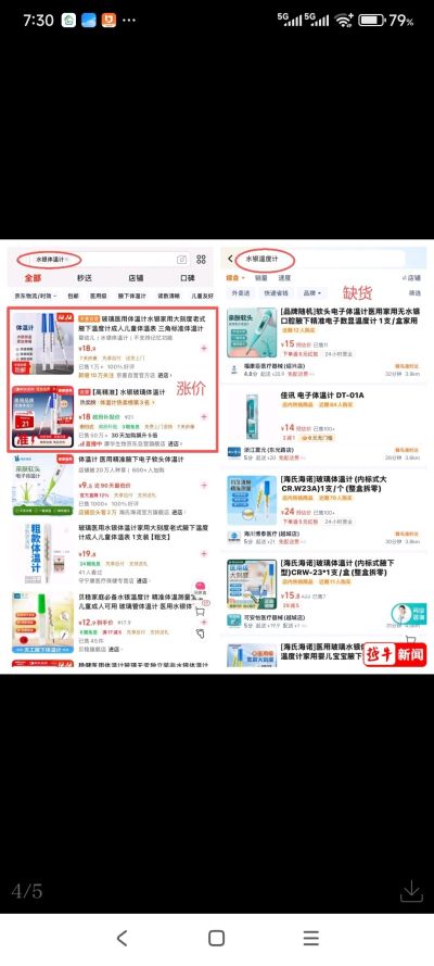记者随后在美团买药、饿了么等本地生活买药平台,以及淘宝、京东等电商平台搜索发现,单支水银体温计售价虽仍标在8-10元左右,但多家店铺已显示“缺货”或“无货”。