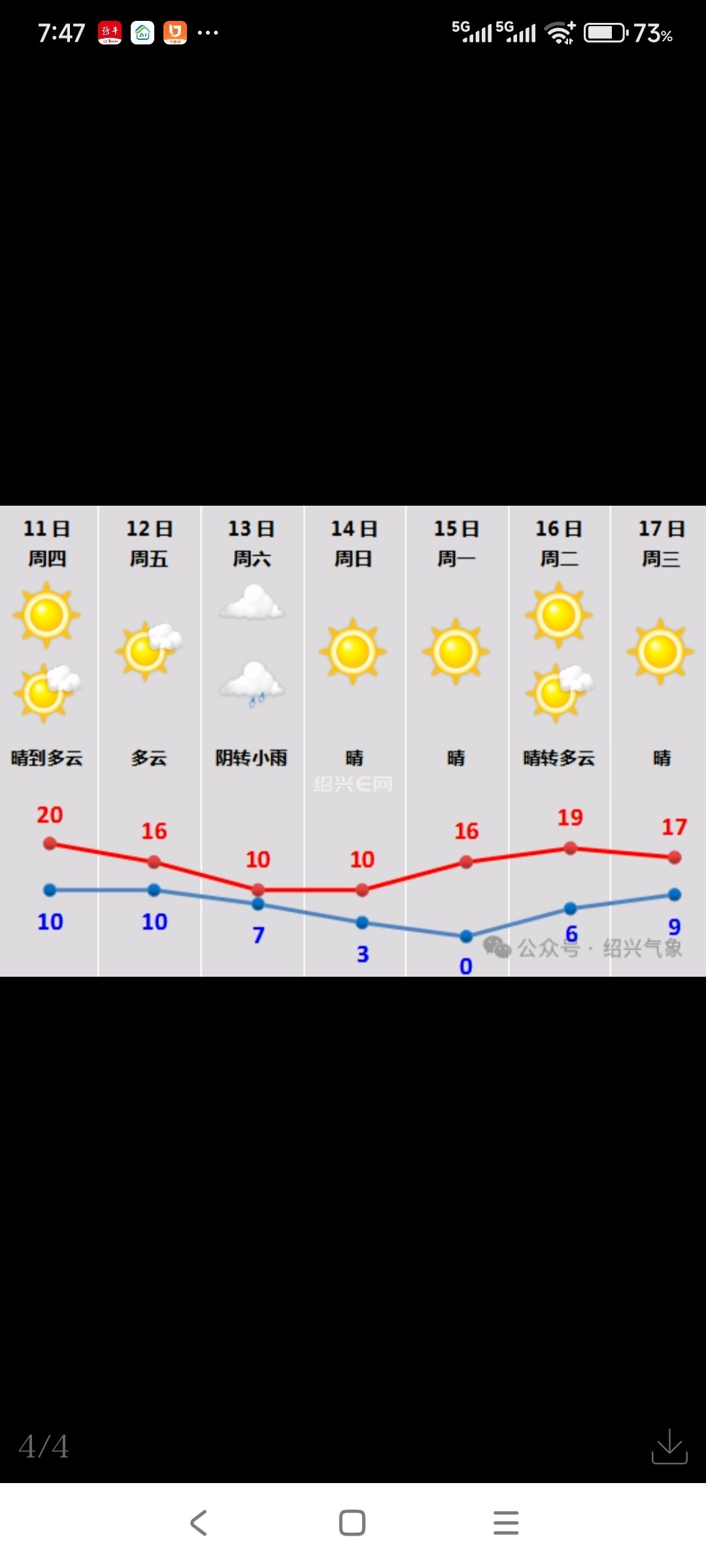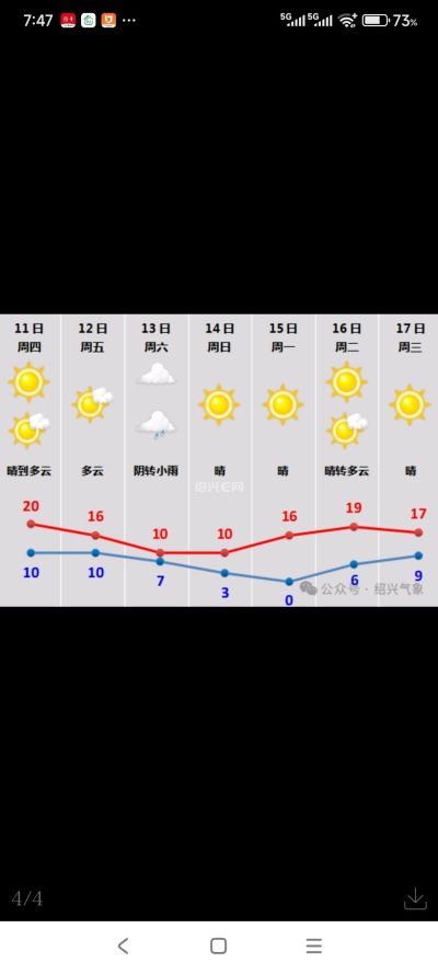 在这股弱冷空气影响下,今天开始上云,绍兴切换为阴天。