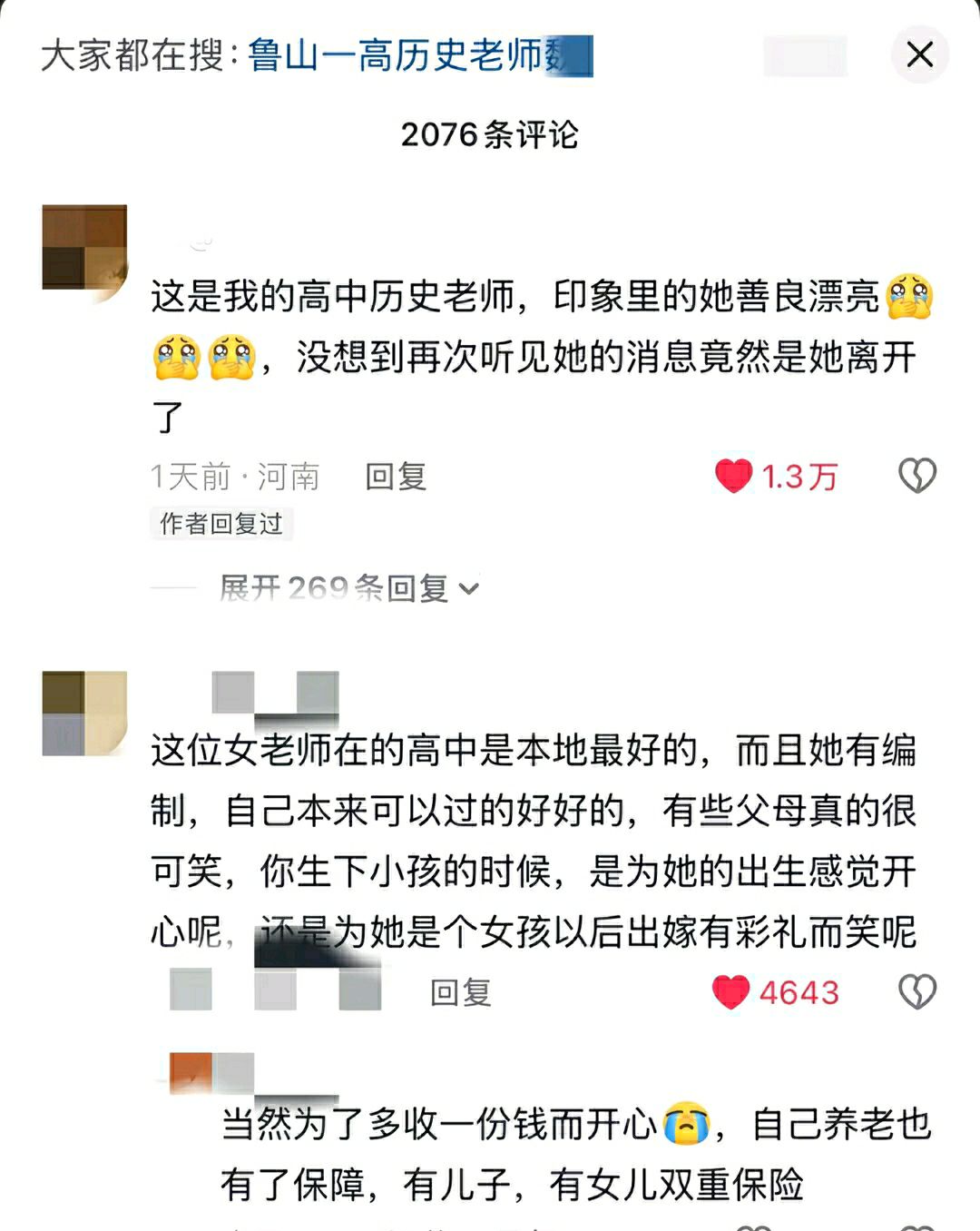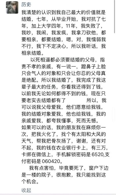 今天中午吃饭的时候刷到一条新闻,一个鲁山一高的女教师在结婚当天t楼自s,图一是这位女教师s前的遗言。