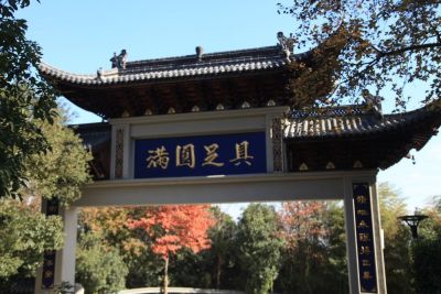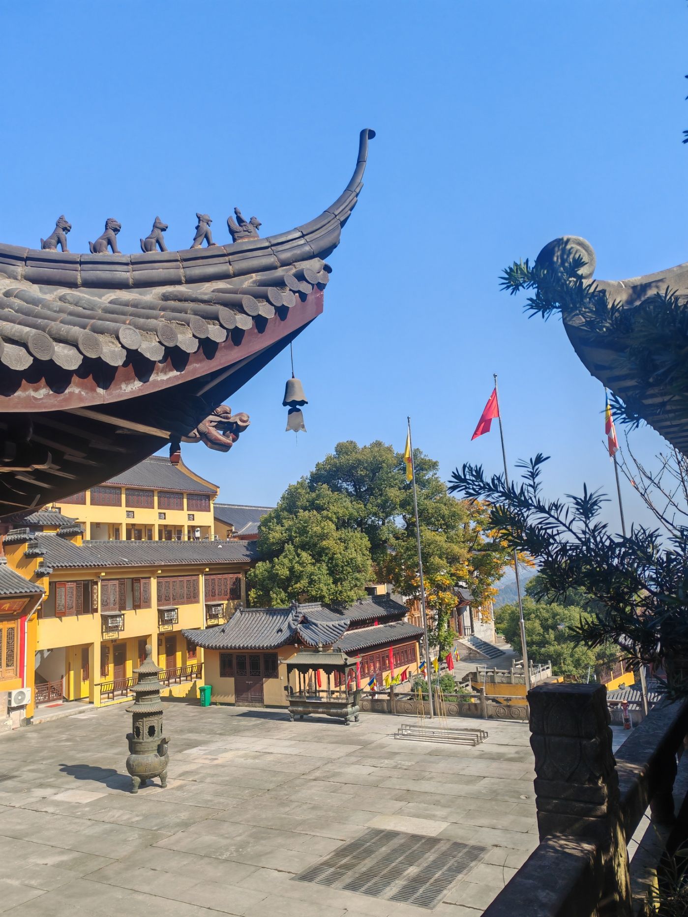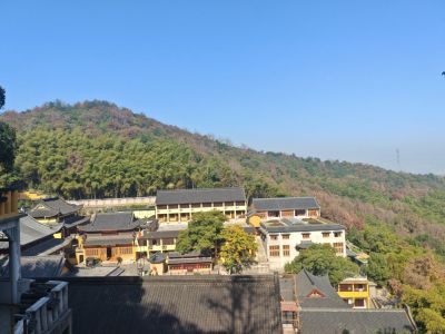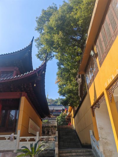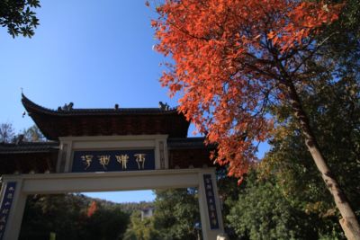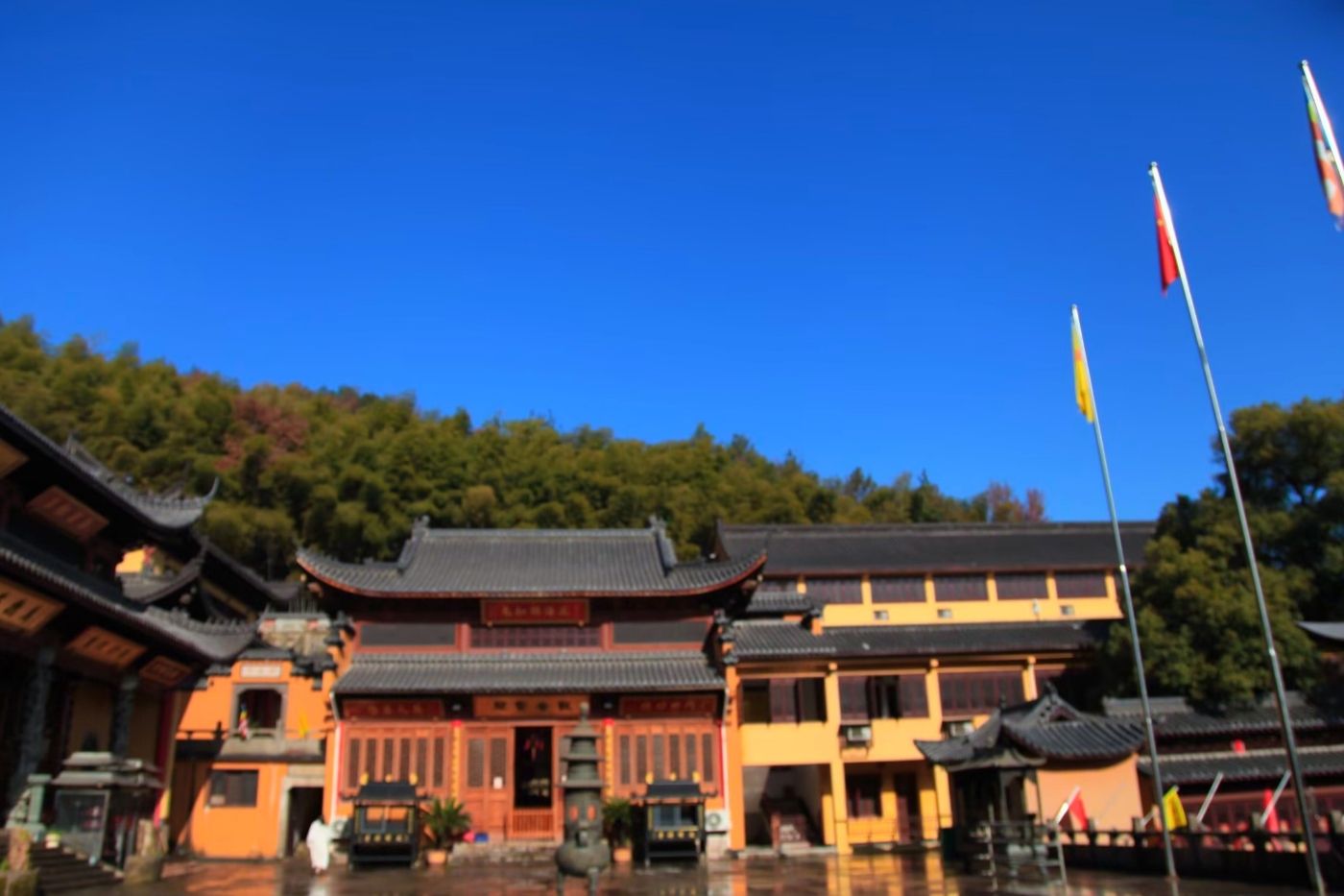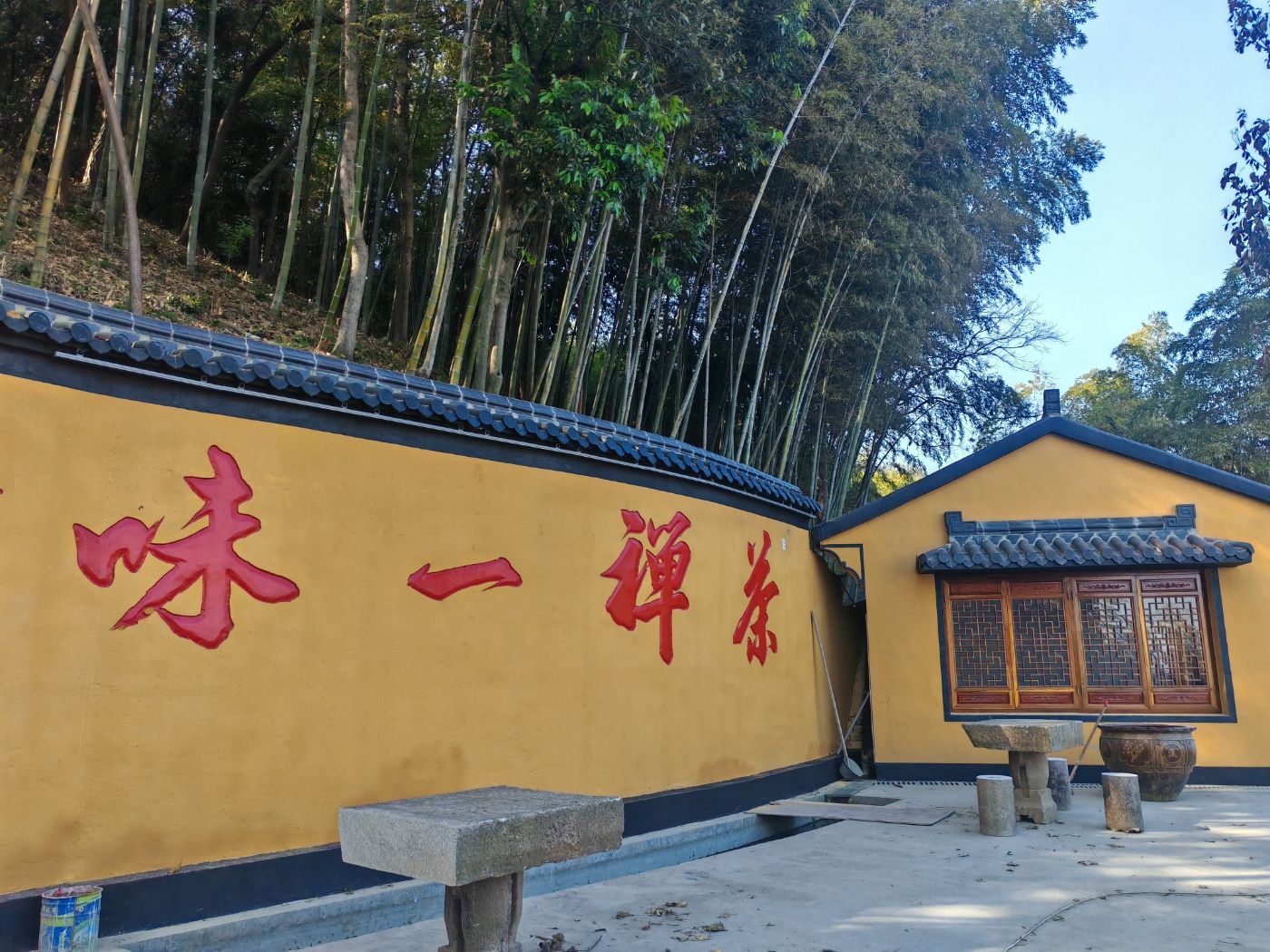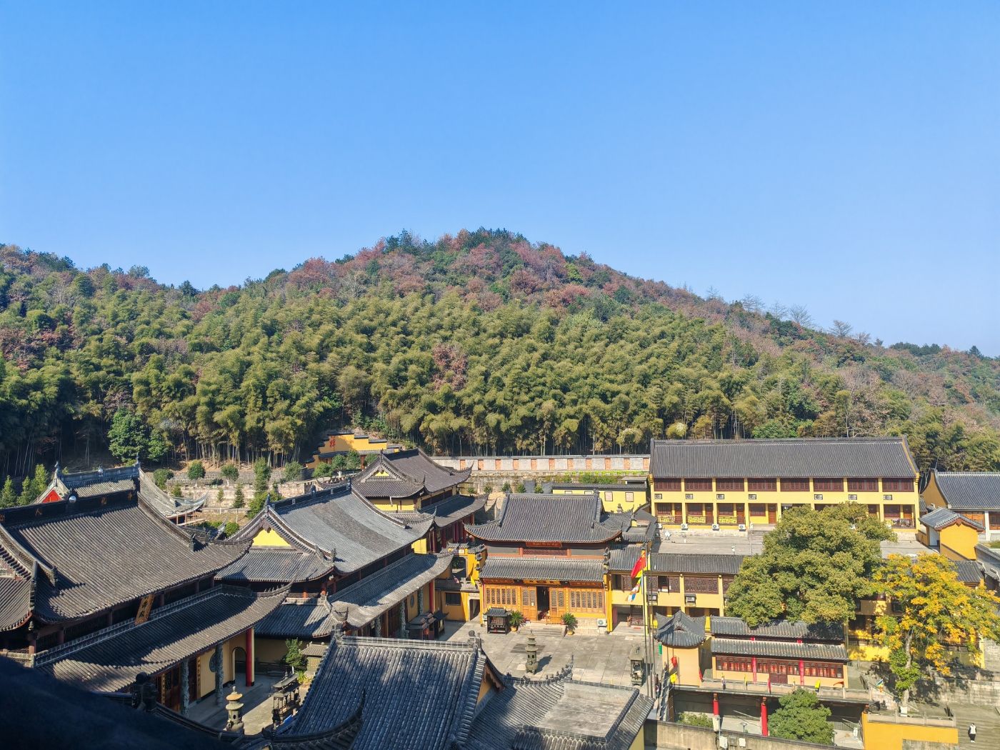 几年前上虞人觉藏法师驻锡该寺,主持扩建该寺,更显宏大庄严,又不失幽静典雅。总体殿宇层叠向上,三面山峦竹林环抱,一面远望山阴城区。主殿是卧佛殿,里面安详的缅甸玉卧佛长9.15米,重达40吨,是大世界基尼斯记录之最,该寺成为名副其实的玉佛道场。整体庙宇群的最高处在环山腰修建了修行步道,游人可以游览观赏寺庙建筑全景,还可以远望山外柯桥城区。修行人则可以隐居禅修,左侧有茶禅一味,右侧有闭关静座,环绕背后有竹林,前面有菜园,清幽雅致。有【朝玉阶】一曲写得好: