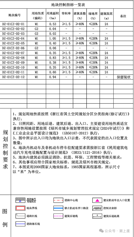 控制要求:一般一类工业用地(M1):容积率≥1.5,绿地率≤20%,建筑系数≥40%,建筑高度≤24米。建筑间距参照《绍兴市城乡规划管理技术规定》(2024年试行)的有关规定执行。规划建筑退让道路红线及用地红线距离参照《绍兴市城乡规划管理技术规定》(2024年试行)规定执行,支路两侧建筑退让道路红线距离为3米,工业建筑退让用地红线距离最小为6米,且必须满足相邻用地建筑消防间距、日照要求。丁宅将在老百悬线旁的工业区打造成生态智能制造产业园,这里应该是丁宅唯一的工业园区吧,这下要改造了,成为虞南地区的智造新引擎。丁宅除了四季仙果外,还有这一处工业区,8个更新地块加1个保留地块。