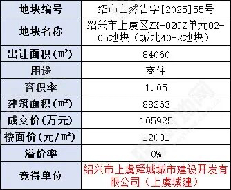 绍兴市上虞舜城城市建设开发有限公司(上虞城建)以底价105925万元竞得绍兴市上虞区ZX-02CZ单元02-05地块(城北40-2地块),楼面价12001元/㎡。