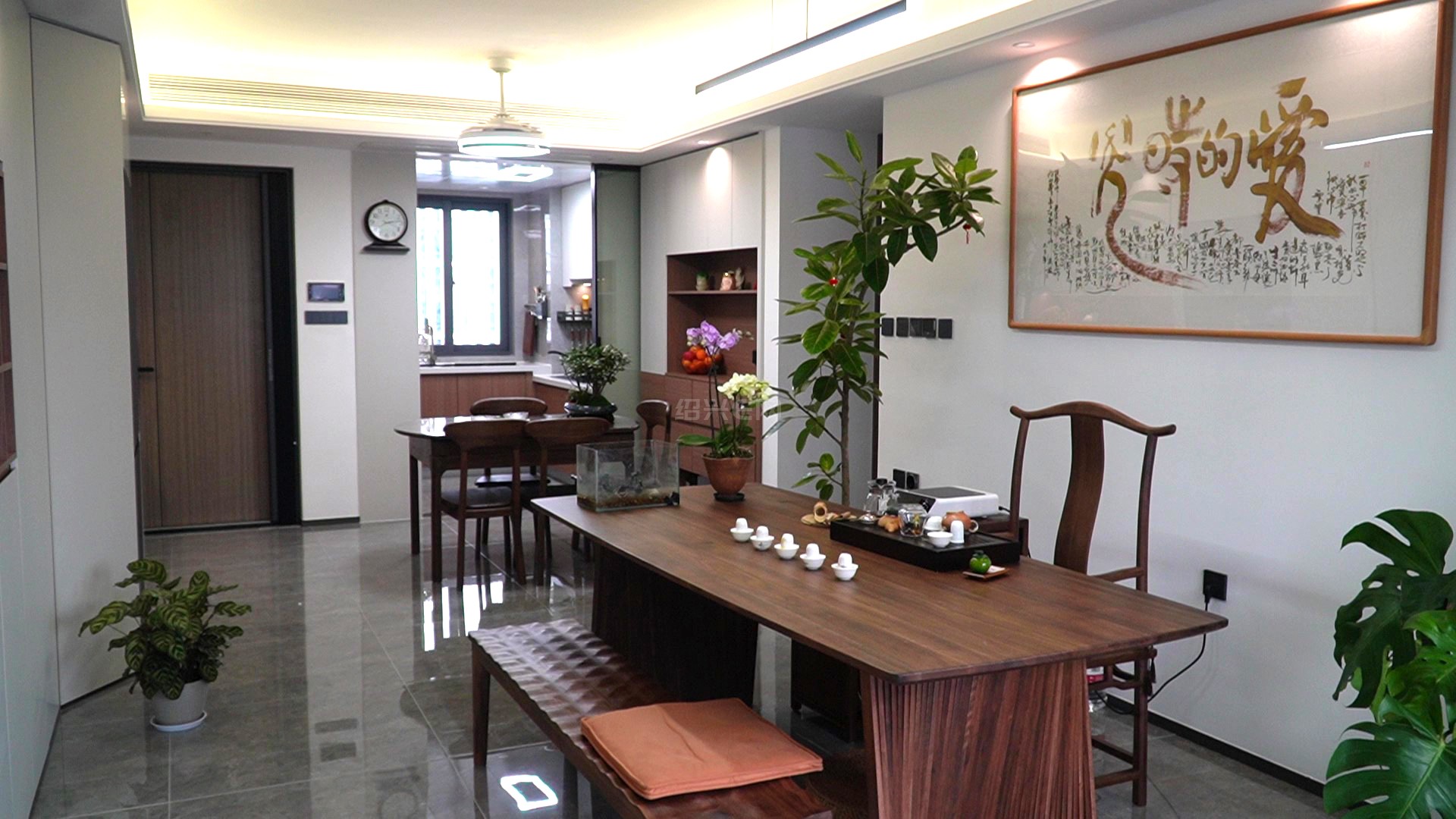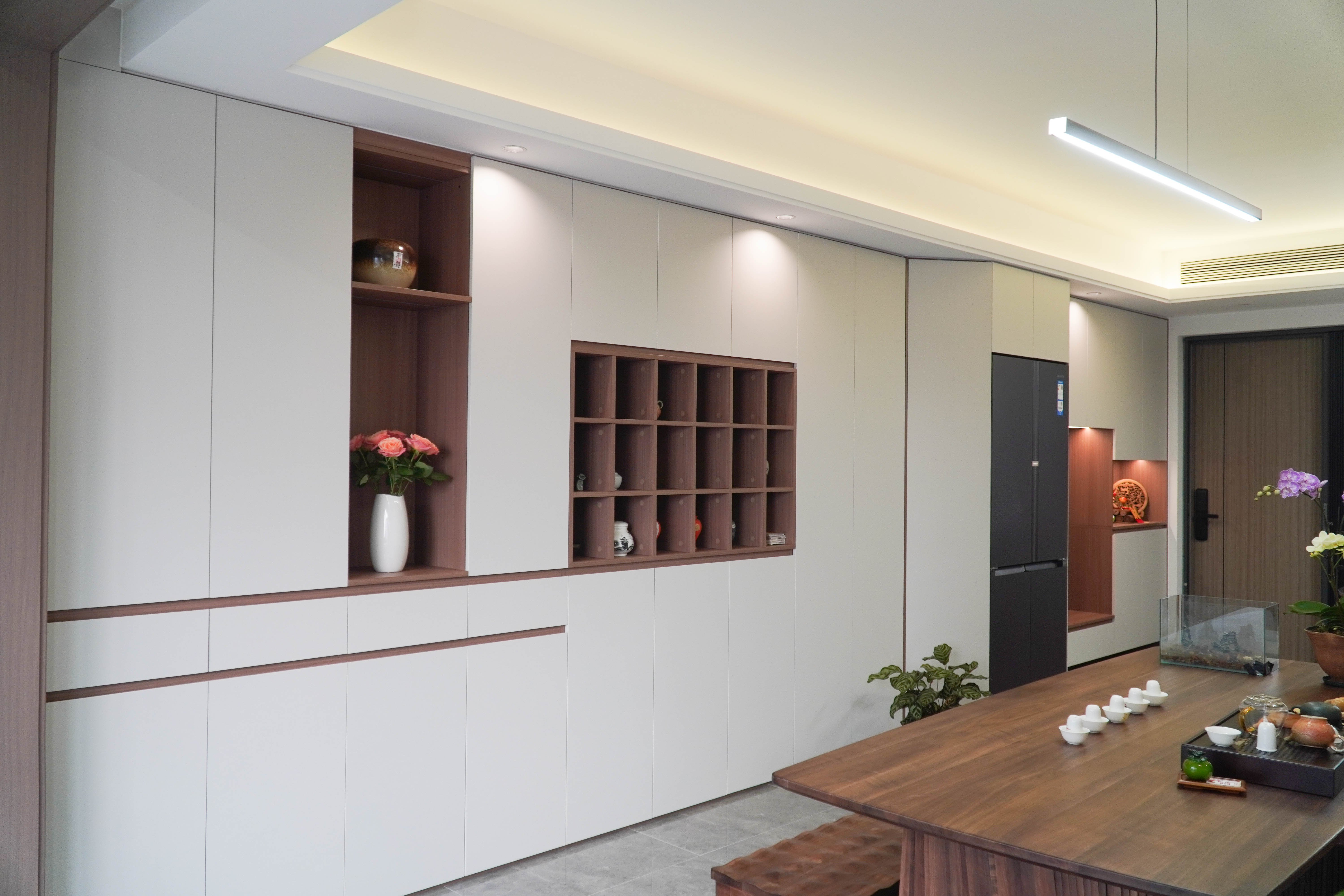 和别家不一样的是这一次来的业主家把客厅打造成了一个大大的茶室与餐厅相连所以,就会显得空间超级大白色柜体与黑胡桃原木的强烈对比色差让整个空间更加的有视觉冲击力