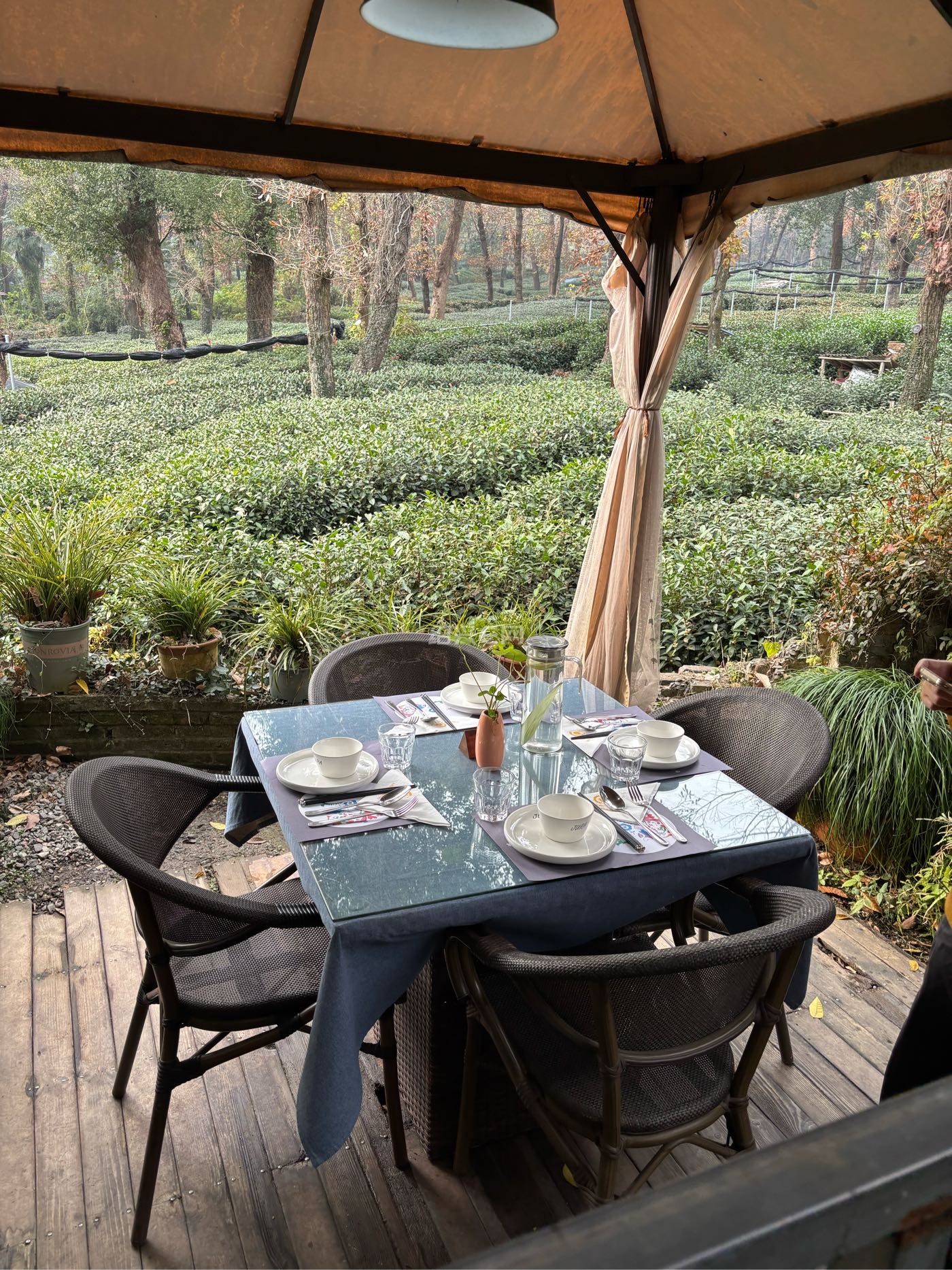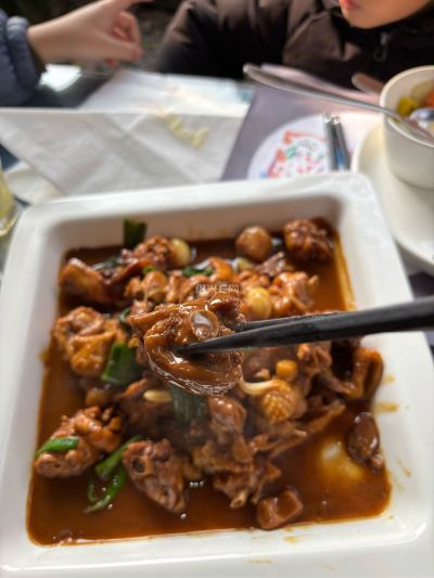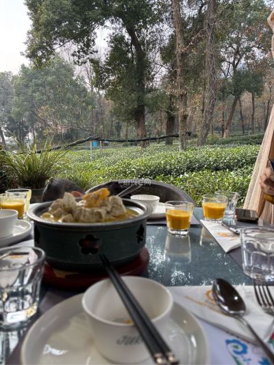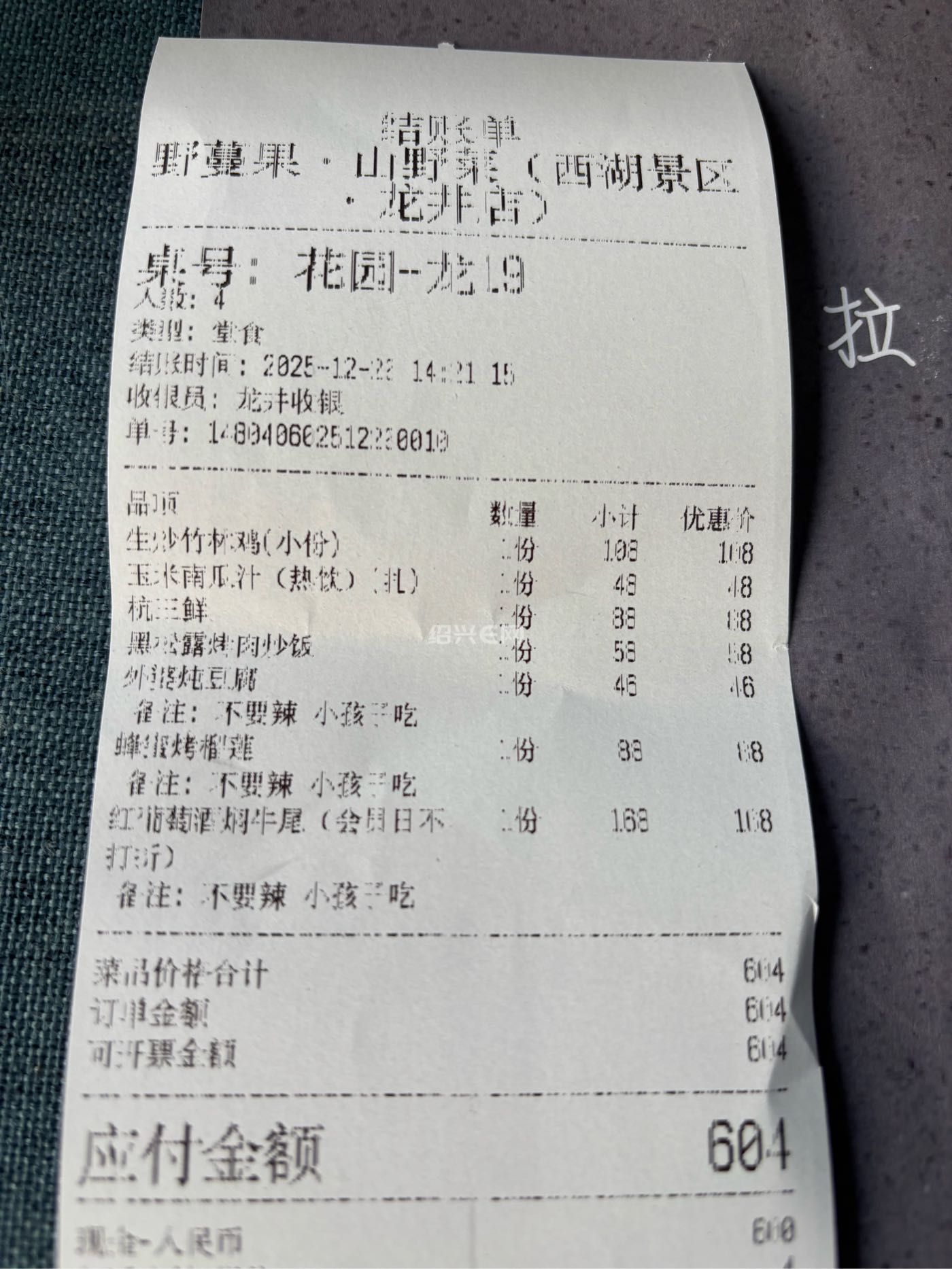 周六上午还在家里开钉钉会的时候,老婆说晚上做了不太好的梦,想去寺庙拜拜,于是10:30开完钉钉就带上两个崽出发去灵隐(也没看人多不多,更别提提前预约),中午在哪里吃也不知道,我一边开车,老婆一边在大众点评找吃的,最后找了个距离灵隐寺大概2-3公里的餐馆,导航这里就直接干过去了,到了后才发现也需要预约,本来想换地方了,发现门口有个露天喝茶的桌子,也就不将就了,直接露天开干吧,餐馆不便宜,关键胜在环境好(反正那一片都是茶园),我们四个人(2个小崽)点了5个菜1个炒饭一个饮料,花了604个,点菜的时候和老板娘说了,老外婆豆腐不要了,但是最后还是上了,想想也算了,