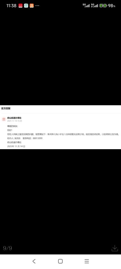 答:新河弄北海小学至八佰伴段暂无征收计划。如后续启动征收,以区政府公告为准。