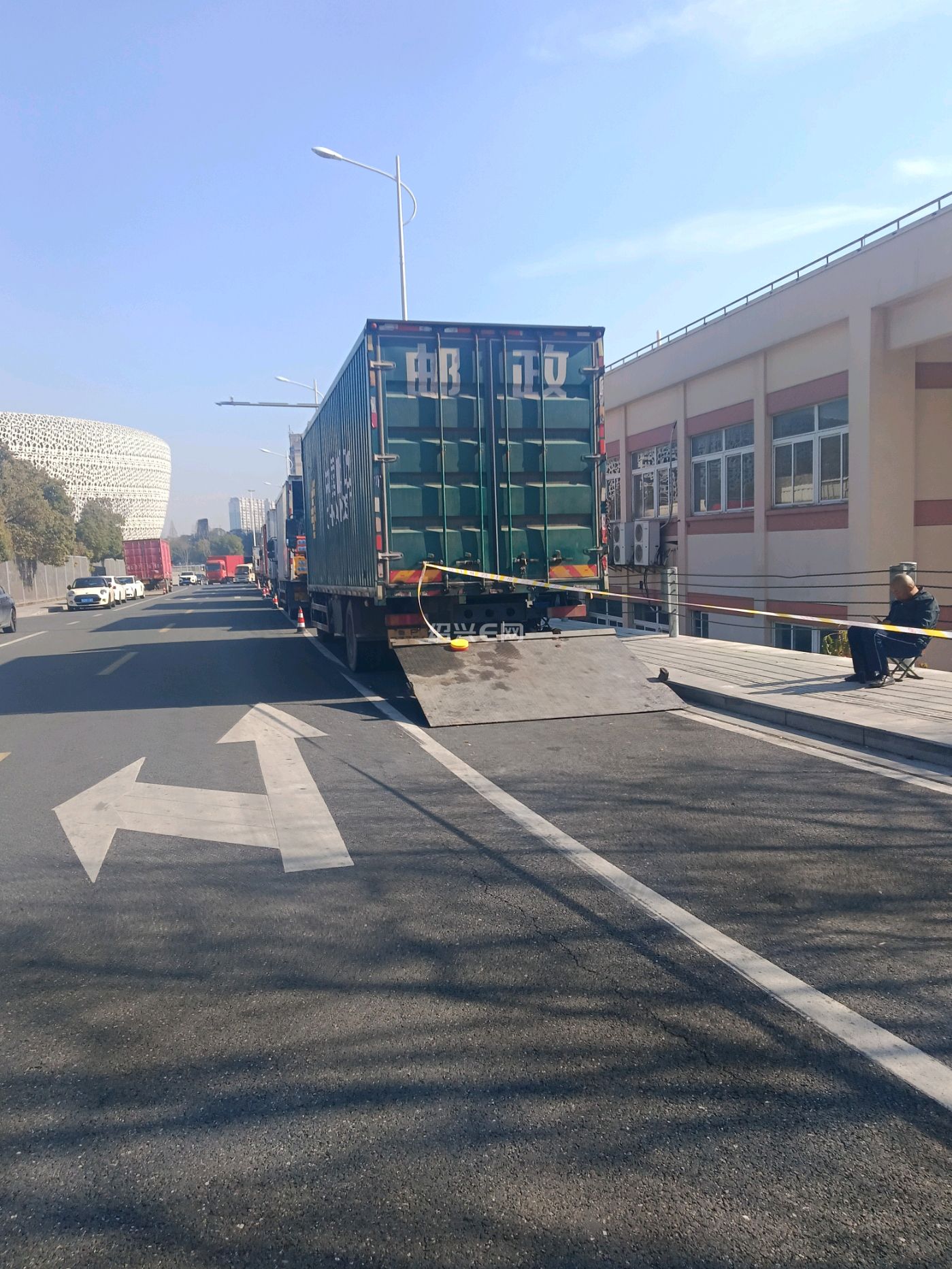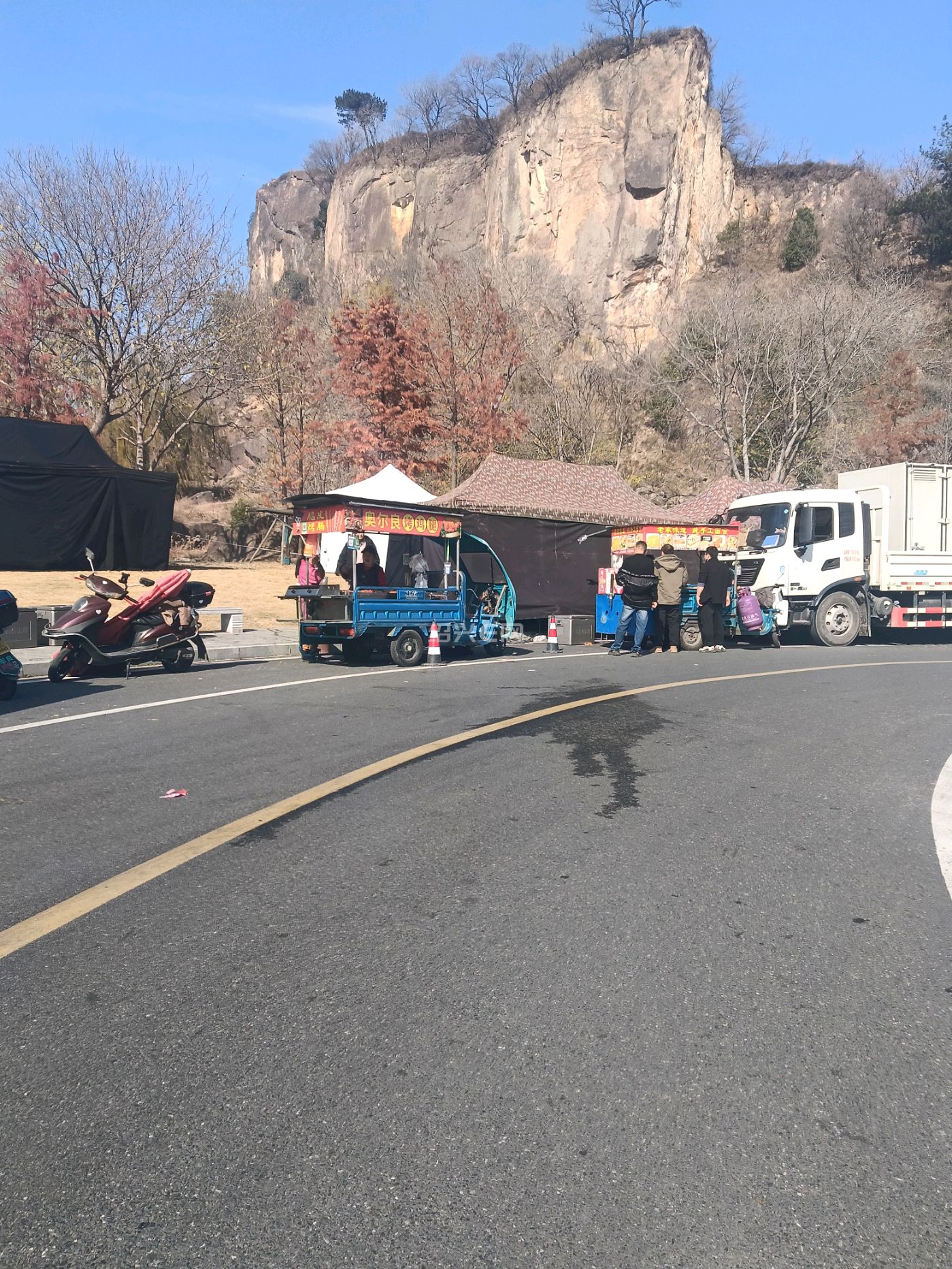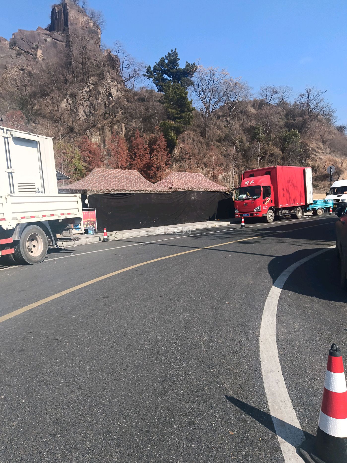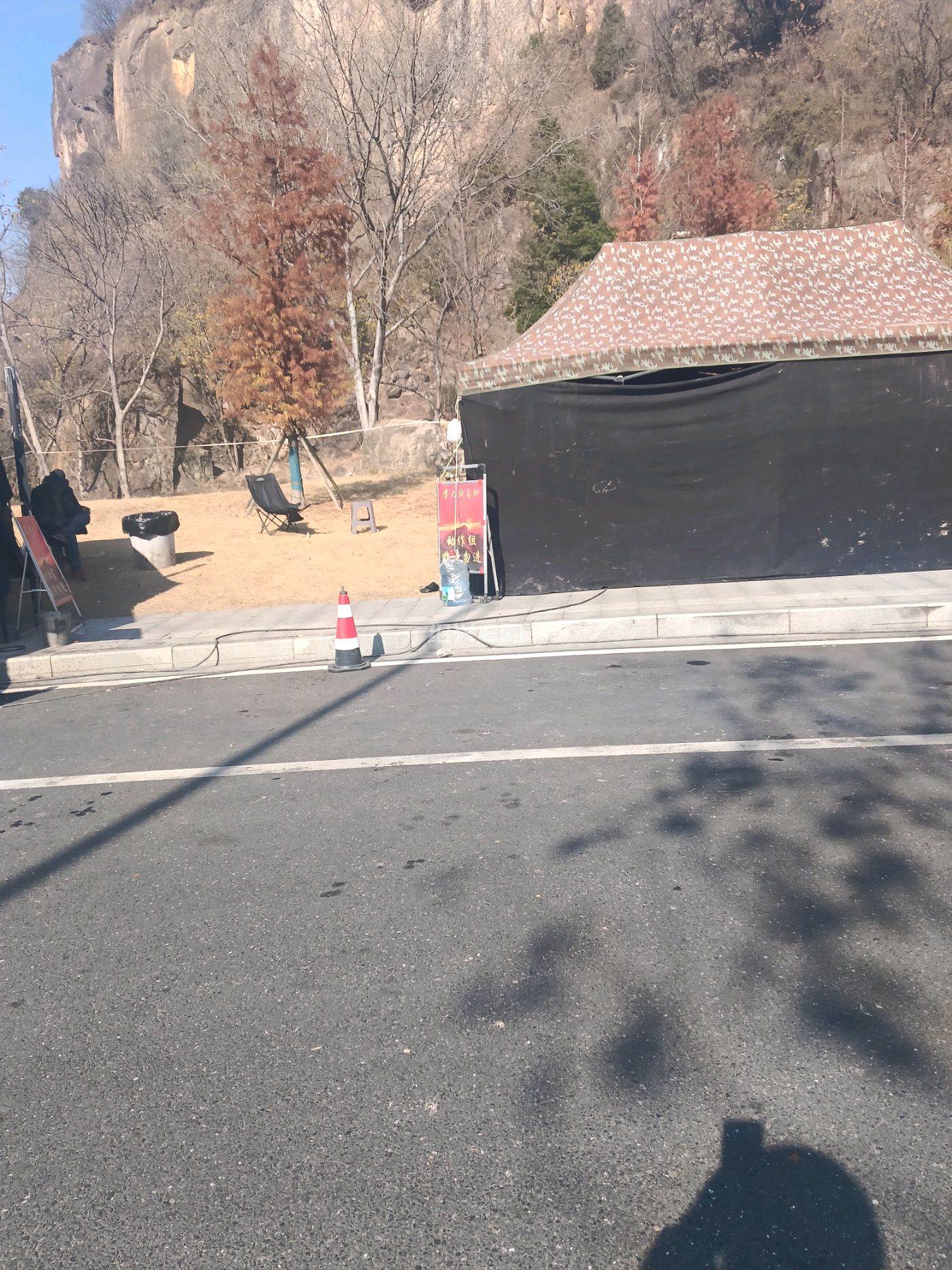 攀岩馆旁边的支路上停满了大大小小的车辆,其中一辆横店影视城的大巴车,货车牌照以京A和沪G为主,路边还搭了几个工作棚,估计是又要拍电视剧了。