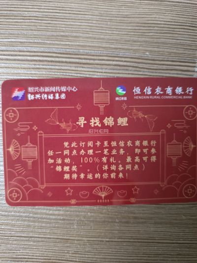 绍兴市新闻传媒中心和恒信农商银行联合发行,官方渠道,靠谱放心!实体卡,保存很新,没啥使用痕迹~