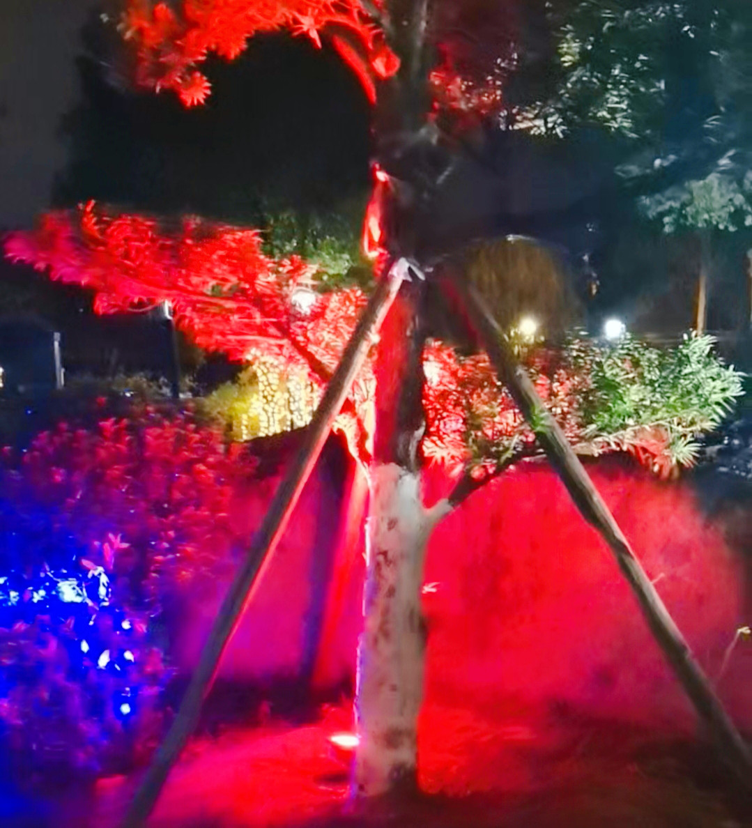 摒弃传统节日装饰的同质化套路,金鸿物业将“定制化美学”与“情感化服务”深度融合,打造“一区一景、一景一味”的灯光景观。各项目团队结合小区建筑风格与社区文化,采用节能环保的LED光源与智能控制技术,通过轮廓灯勾勒楼宇线条,用主题灯组点缀园林步道,以动态光效营造沉浸式氛围——有的小区以暖黄灯光串联成“时光长廊”,寓意岁月静好;有的以七彩灯带打造“星空庭院”,成为亲子打卡胜地;还有的融入国潮元素,让红灯笼与流动光带相映成趣,尽显传统与现代的碰撞之美。既保障景观效果,又兼顾居民生活舒适度 。