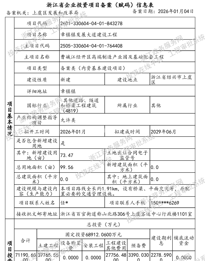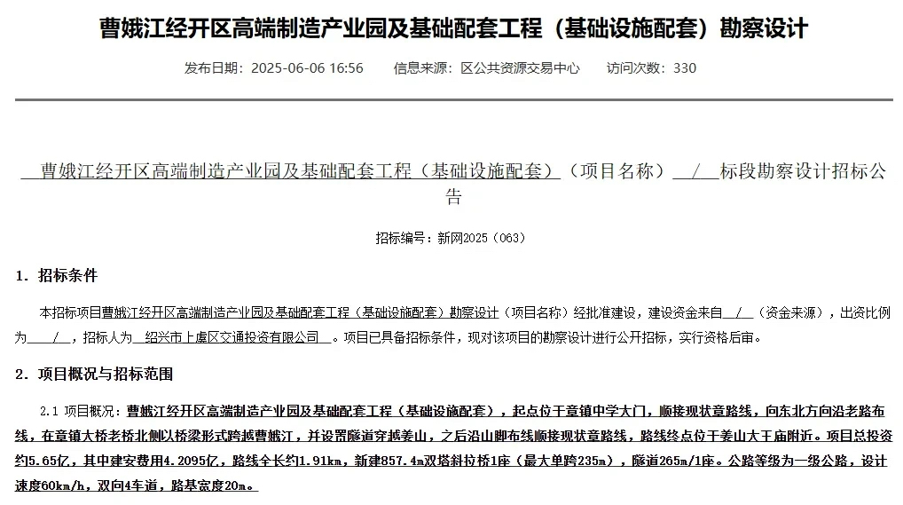 官方发布了章镇镇发展大道建设工程的项目备案表,路线全长约1.91km,上虞将建设一座新的跨江大桥。项目名称:章镇镇发展大道建设工程;拟开工时间:2026年01月;拟建成时间:2029年06月;总用地面积:99.56亩;新增建设用地:73.47亩;总投资7.119亿元。建设内容:本项目路线全长约1.91km,设有桥梁、平面交叉等,并配置必要的交通管理设施。去年六月,官方发布了曹娥江经开区高端制造产业园及基础配套工程(基础设施配套)勘察设计。项目概况:曹娥江经开区高端制造产业园及基础配套工程(基础设施配套),起点位于章镇中学大门,顺接现状章路线,向东北方向沿老路布线,在章镇大桥老桥北侧以桥梁形式跨越曹娥江,并设置隧道穿越姜山,之后沿山脚布线顺接现状章路线,路线终点位于姜山大王庙附近。项目总投资约5.65亿,其中建安费用4.2095亿,路线全长约1.91km,新建857.4m双塔斜拉桥1座(最大单跨235m),隧道265m/1座。公路等级为一级公路,设计速度60km/h,双向4车道,路基宽度20m。章镇大桥建于1978年,是我国第一座独塔预应力,混凝土公路斜拉桥,由数智交院的前身,省交通设计院主持设计。相比传统的梁式桥,斜拉桥的跨越能力更大、稳定性更好,20世纪70年代刚从国外引进,作为当时国际先进的桥梁技术,国内尚无实践经验,章镇大桥成了浙江地区唯一试点项目。章镇大桥建设场景