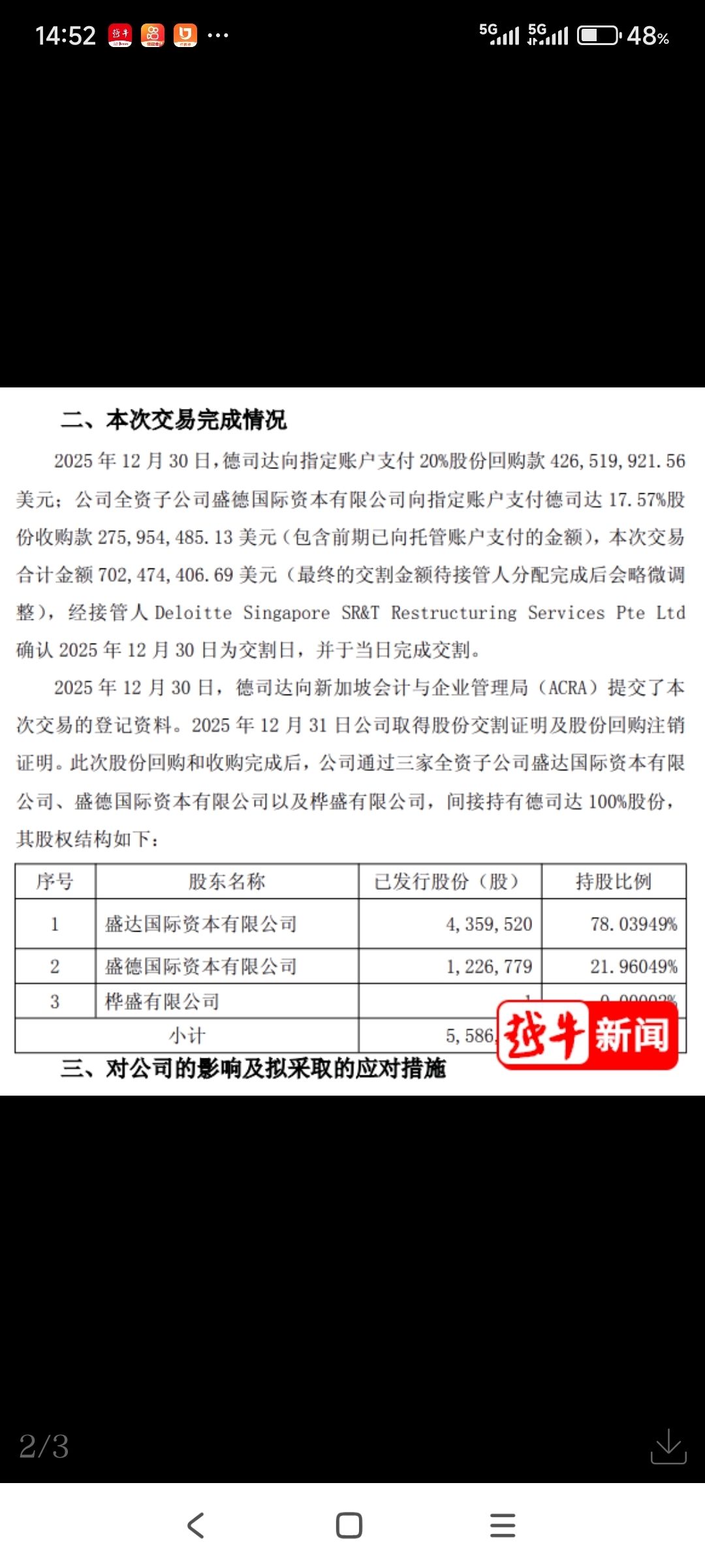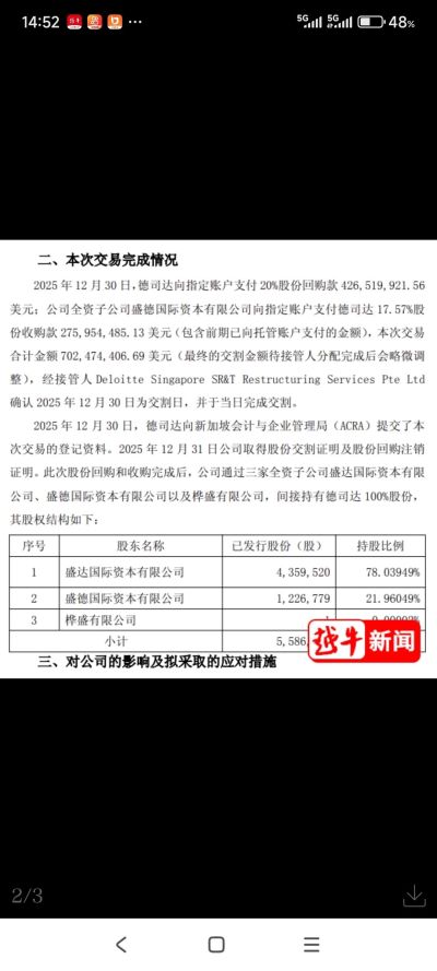 整个交易由两部分组成:德司达向指定账户支付20%股份回购款4.27亿美元;公司全资子公司盛德国际资本有限公司向指定账户支付德司达17.57%股份收购款2.76亿美元(包含前期已向托管账户支付的金额),合计7.02亿美元。当日完成交割,12月31日公司取得股份交割及回购注销证明。交易完成后,浙江龙盛通过三家全资子公司间接持有德司达100%股份,将对公司经营业绩产生积极影响。