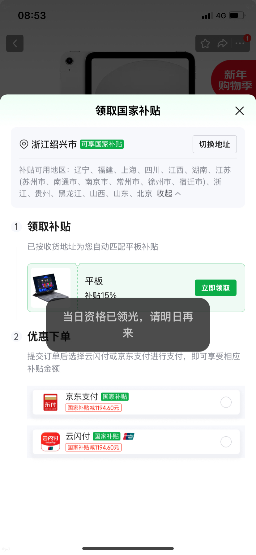 支撑了6年的平板电脑,因为苹果的持续系统升级,终于扛不住,寿终正寝了。打算趁着国补买一个,结果,我点了购买,显示2999,我再看一眼,需要领取补贴。回上去点了一下,资格今天用完了。原来是我天真了