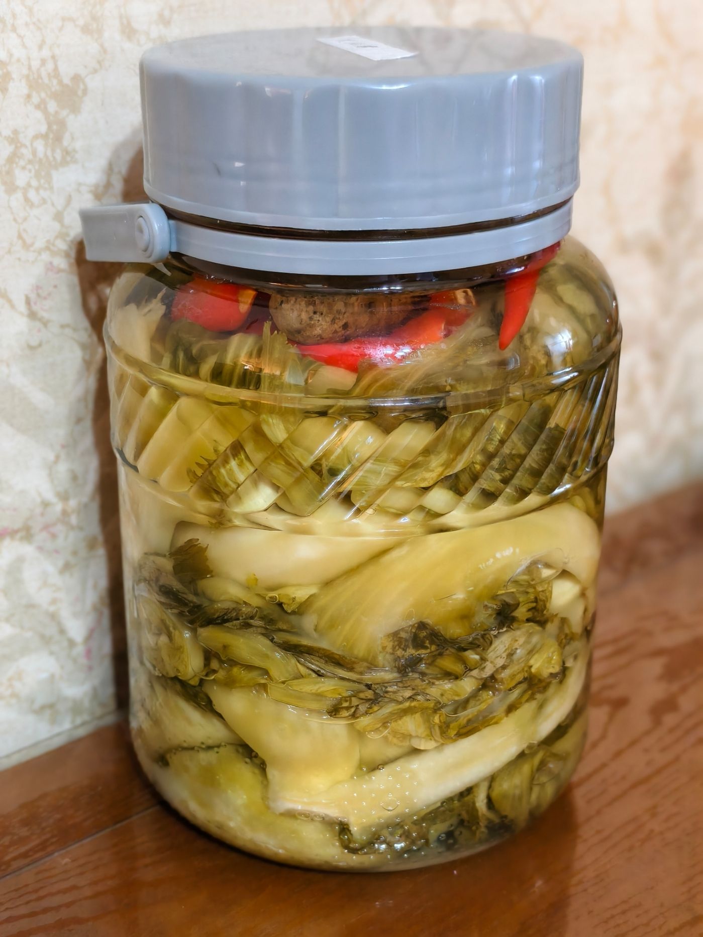 :唯版,很简单的,包芥堆酵两天,然后老叶子剥下,对切洗干净晾干,放入盆中,十斤菜四两盐的比例放入粗盐杀水,然后整齐码放入合适的瓶或坛,老叶子做盖面菜,放适合自己口味的小米椒,另将淘米水煮开放凉,然后将放凉的淘米水倒入至没过小米椒,最后压上压缸石,盖上瓶盖,每隔两三天开盖排气,半个月左右可不再排气拧紧盖子任其继续发酵半个月。...(2026-01-16 11:42)