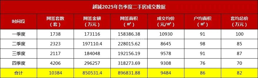 资料显示,2025年越城区新房网签3984套,签约面积54.14万平方米,套均成交面积上升,改善型好房子受市场欢迎;全年二手房累计网签11009套,网签面积102.06万平方米,较上一年上涨10.5%,“小面积、低总价”成为成交主流;全年商住土地拍卖成交22宗,成交金额33.57亿元,土地拍卖市场趋向稳定,且成交溢价有所上升。