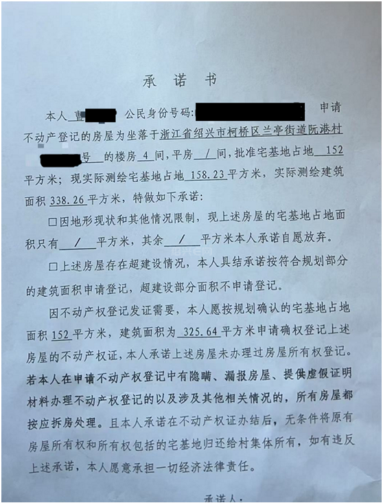 现在,分家析产终于走到了公告后不动产登记这一步,兰亭街道的工作人员又给我出了一个“难题”:必须签订一份《承诺书》,内容竟然是“若本人在申请不动产权登记中有隐瞒、漏报房屋、提供虚假证明材料办理不动产权登记的以及涉及其他相关情况的,所有房屋都按应拆房处理。且本人承诺在不动产权证办结后,无条件将原有房屋所有权和所有权包括的宅基地归还给村集体所有,如有违反上述承诺,本人愿意承担一切经济法律责任。”