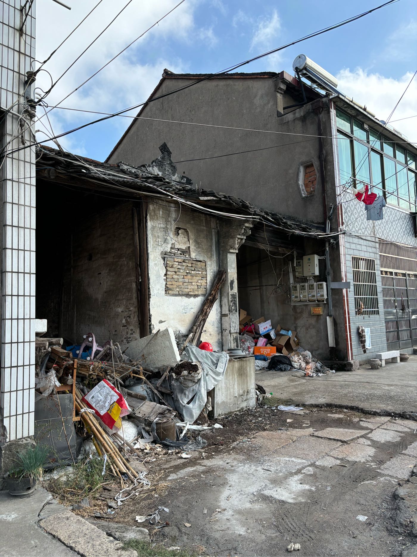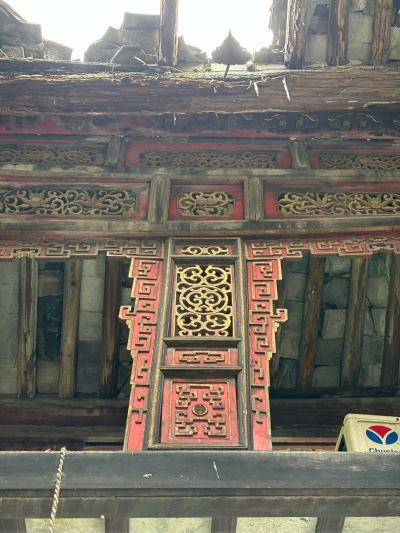 原台门建于清,主人确实有点厉害,台门曾有旗杆石。不幸在民国初期遭受一场大火,台门几乎被尽毁,而村民形容这台门之大,说当年一场大火都没把台门烧穿……